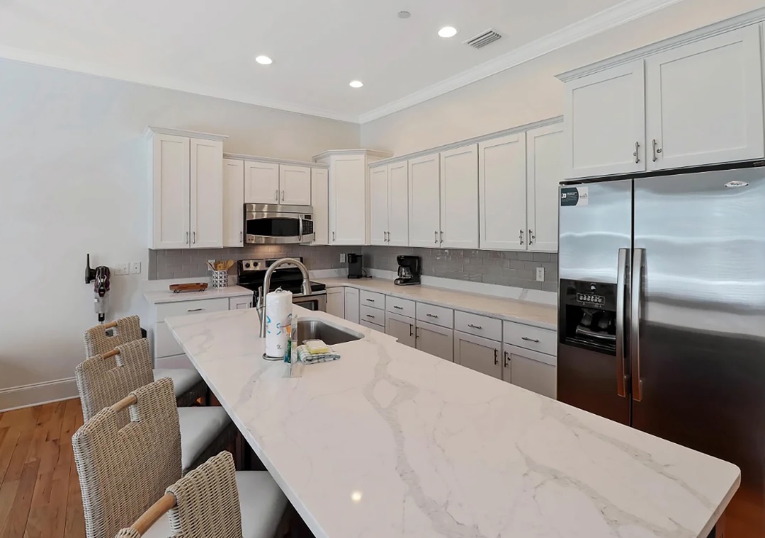 1 Rooftop Relaxation in Santa Rosa Beach, Florida, bright and filled with coastal charm, this stunning four-bedroom, four-bathroom townhome offers the ultimate vacation experience. With an impressive rooftop observation deck providing breathtaking views of the Gulf, this home is designed for comfort and relaxation. The open-concept living spaces are bathed in natural light, creating an inviting atmosphere where everyone can gather and enjoy each other’s company. The living room boasts plush seating, perfect for cozy movie nights in front of the Smart flat-screen TV. For those who enjoy cooking, the fully equipped kitchen features stainless steel appliances and all the kitchen gadgets you need to prepare delicious meals. On the first floor, you’ll find the first guest bedroom, offering twin/twin and queen/queen bunk beds. The second guest bedroom is on the second floor and includes two twin beds with an attached bathroom. The third floor is home to the king master bedroom with an attached bathroom, along with the third guest bedroom featuring a king bed and another attached bathroom. This spacious townhome comfortably sleeps 12, making it ideal for families or large groups. In the evening, step out onto the balcony and enjoy the refreshing Gulf breeze while taking in the stunning surroundings. Or, head up to the rooftop terrace to watch the sunset over the Gulf Coast, as the Florida sky transforms into a vibrant display of colors. Create lasting memories at 1 Rooftop Relaxation—a place where unforgettable moments are waiting to be made.