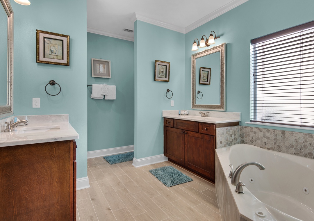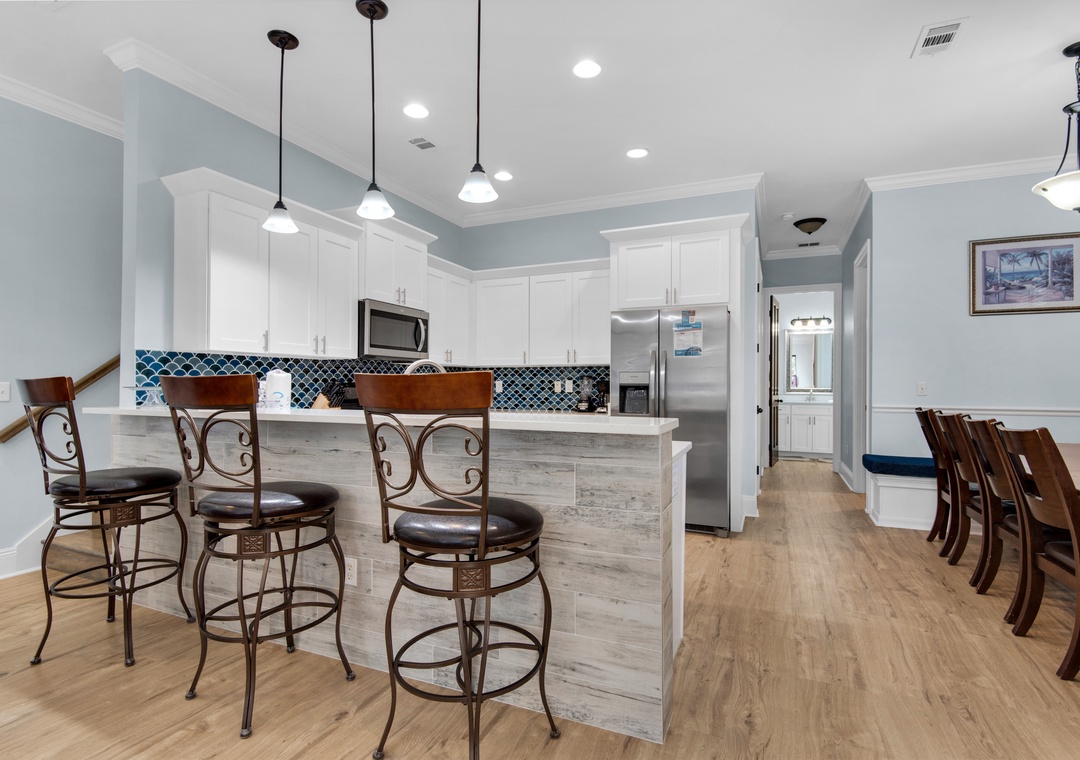This fabulous home in Villages of Crystal Beach boasts modern flooring, a fully equipped kitchen with a large booth-style dining table, two gorgeous balconies, and two relaxing living rooms. A Wave Away is a 5 bedroom, 4 bath home that sleeps up to 15 guests. There are 3 King bedrooms, one on every floor! The master is on the 2nd floor and features a jetted tub, a separate stand-up shower, his and her sinks, plus a kitchenette! There is a guest room with a queen bed located on the 2nd floor, and a guest room with a twin over full bunk bed + futon on the 3rd floor. This magnificent house also has a full-size laundry room with a washer/dryer, and 2 parking spots in the driveway. This luxurious community is about 900 yds from Crystal Beach and includes a complimentary seasonal trolley service to take you to and from the Gulf!