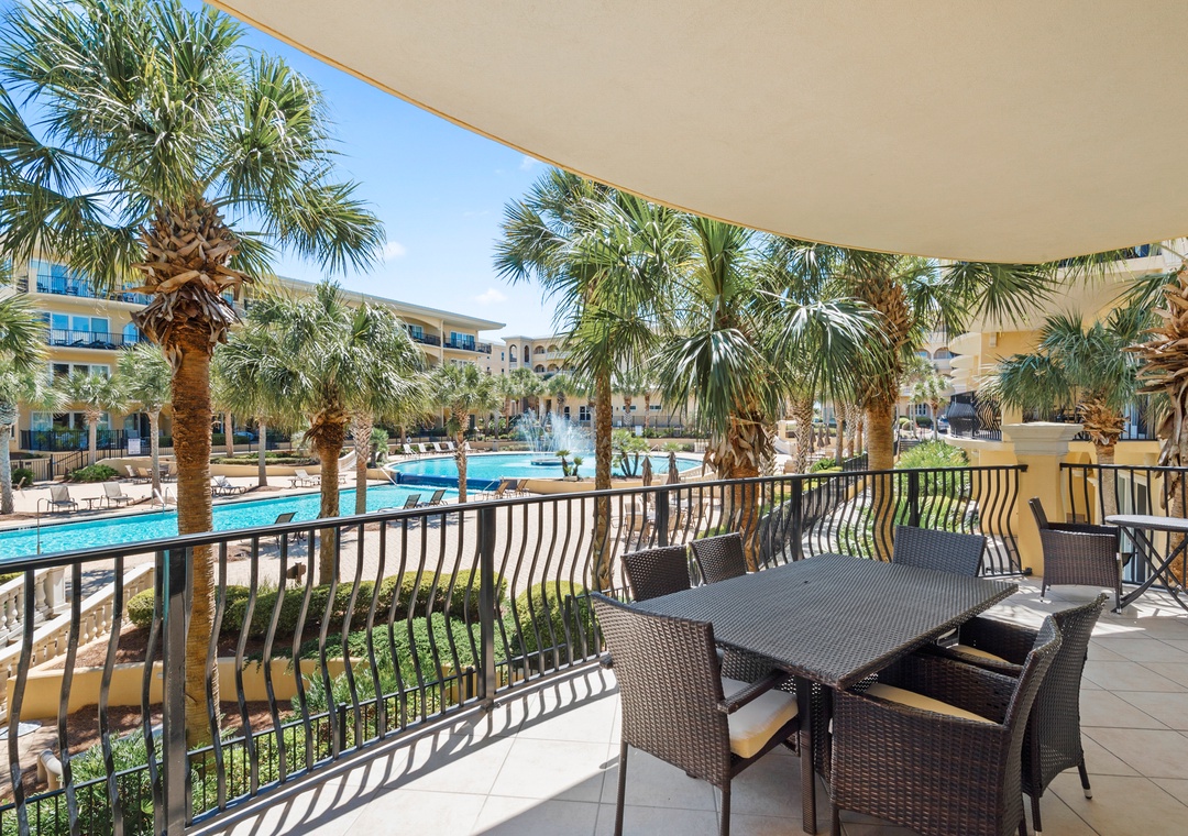 Some other pros for this spot— it’s a corner unit for the building it’s in, and the balcony is partially shaded by several palm trees, so it feels like it is both private and still has a lovely view to the pool.