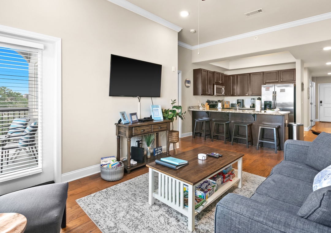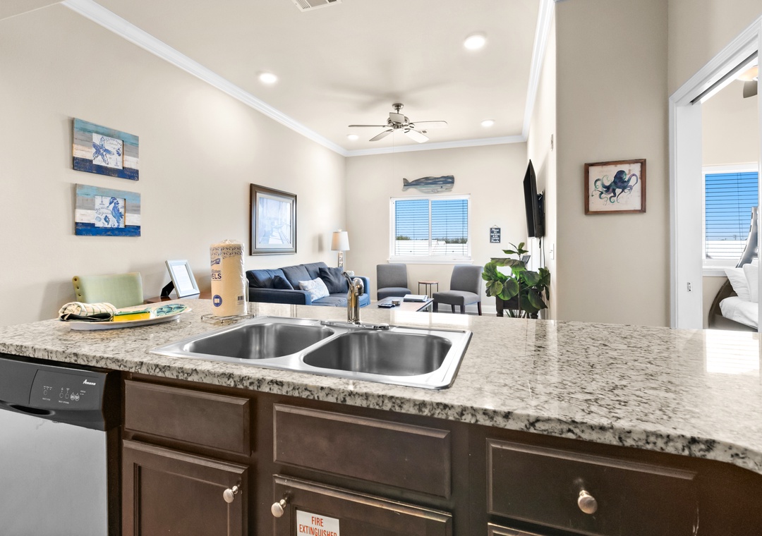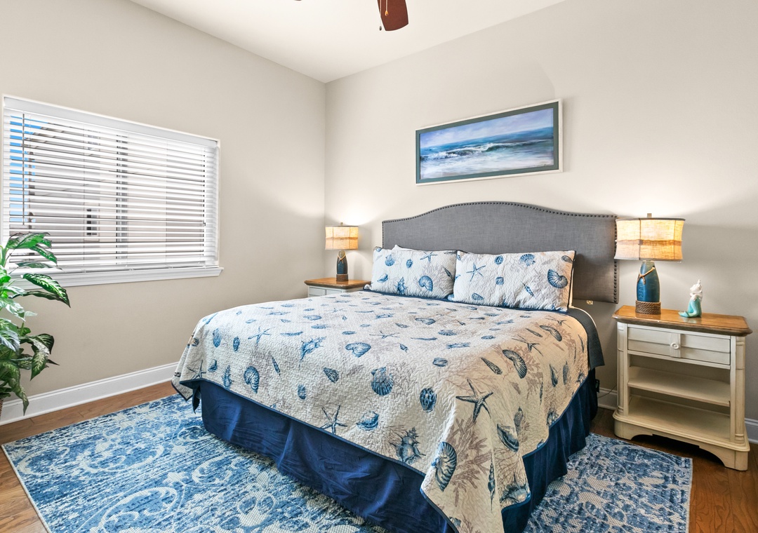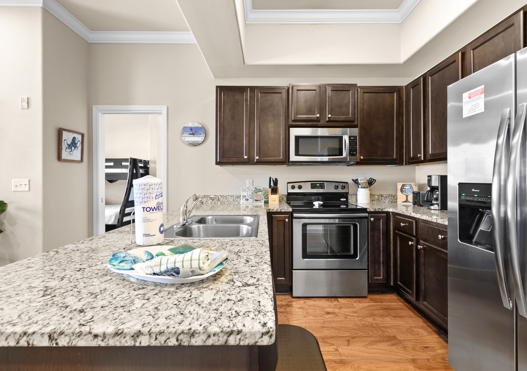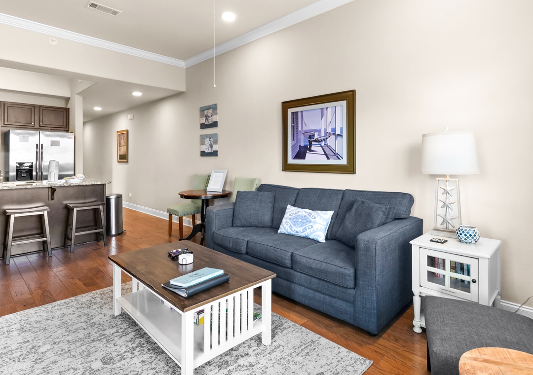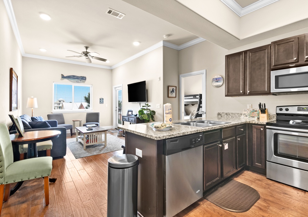 Inside, you’ll find an open-concept living space with 10-foot ceilings, stylish furnishings, and a fully equipped kitchen featuring granite countertops and stainless steel appliances. Relax in the cozy living area, enjoy meals at the dining table or breakfast bar, and step out onto the private covered balcony to take in the fresh Emerald Coast air.