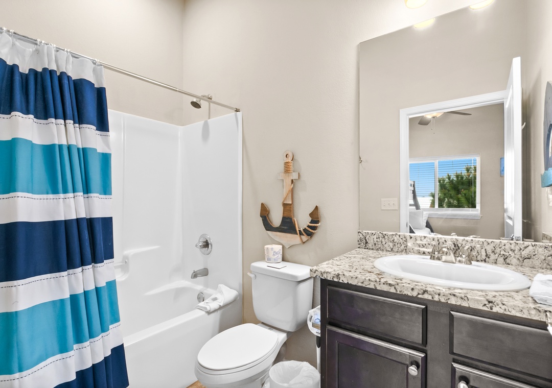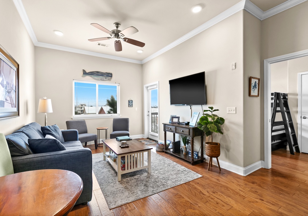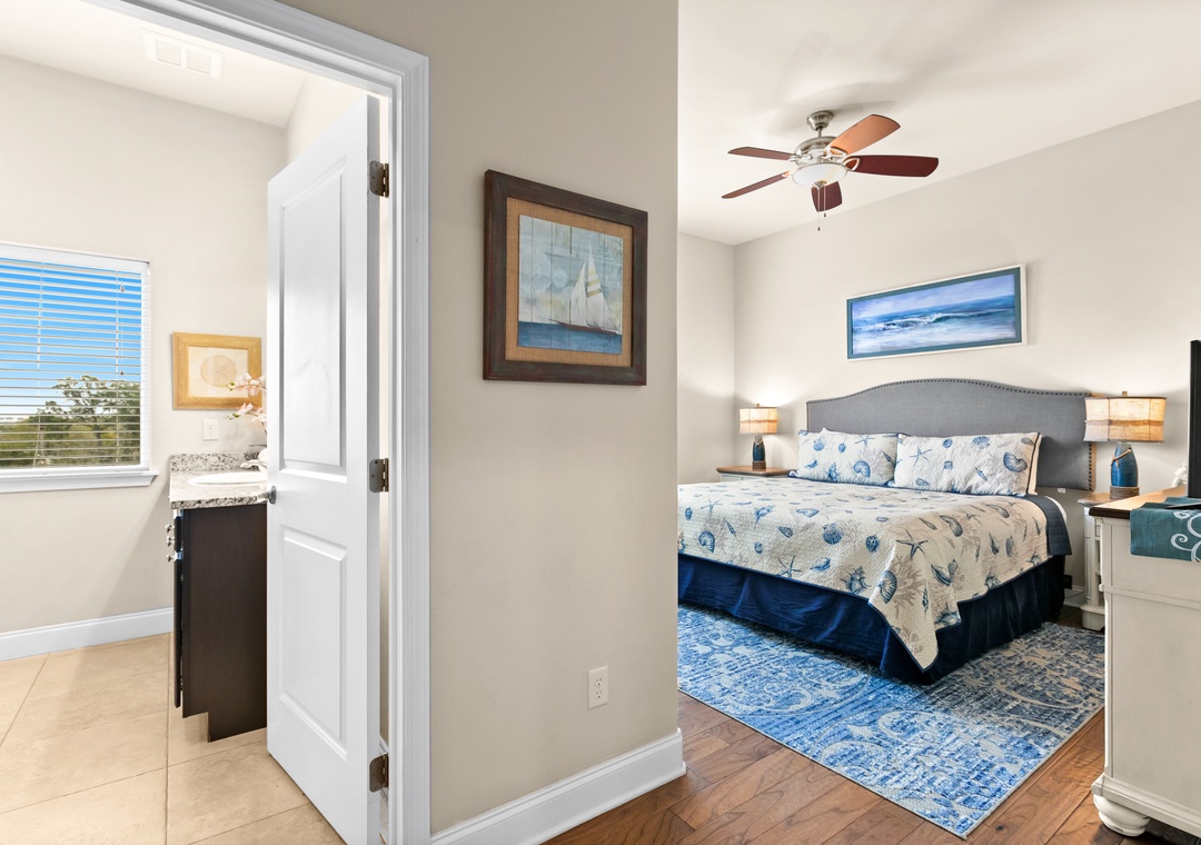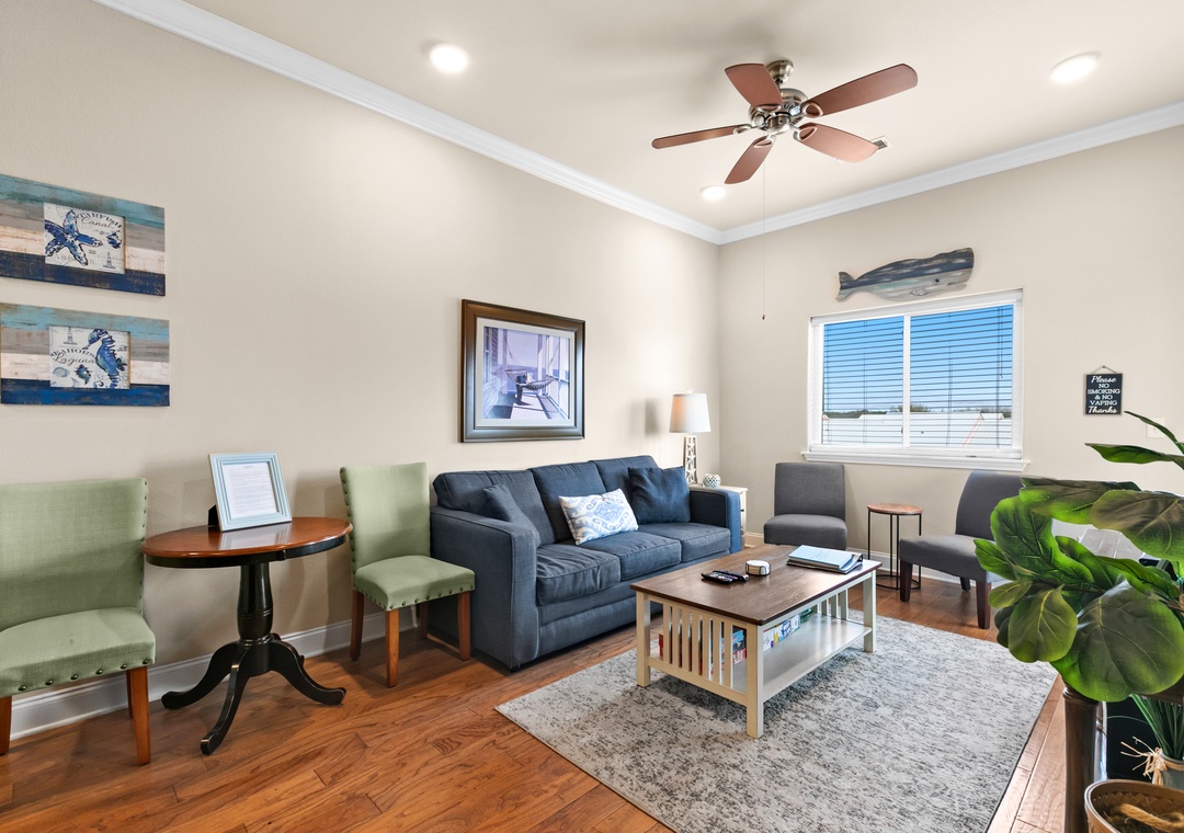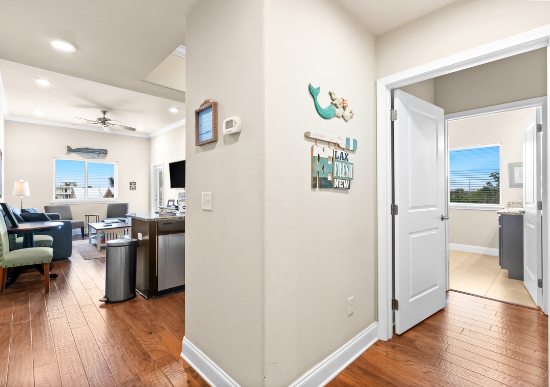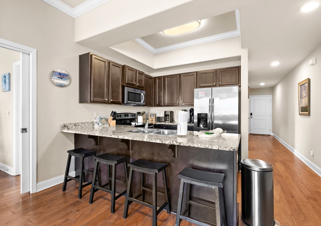 Inside, you’ll find an open-concept living space with 10-foot ceilings, stylish furnishings, and a fully equipped kitchen featuring granite countertops and stainless steel appliances. Relax in the cozy living area, enjoy meals at the dining table or breakfast bar, and step out onto the private covered balcony to take in the fresh Emerald Coast air.