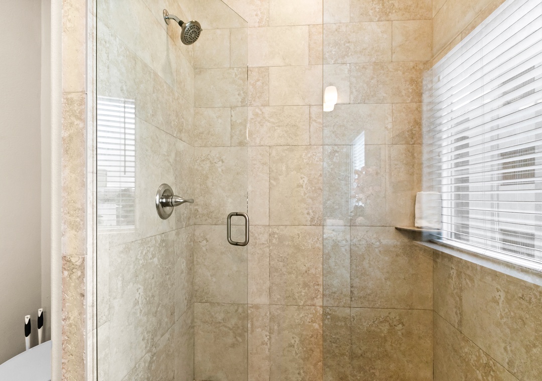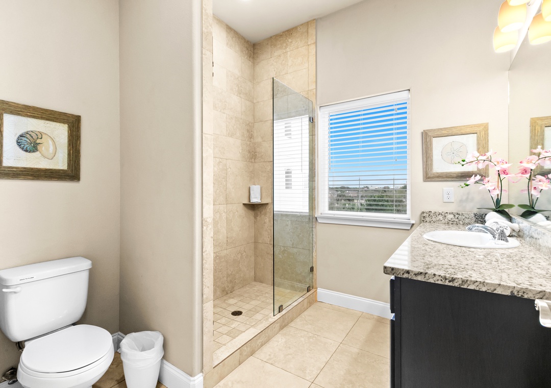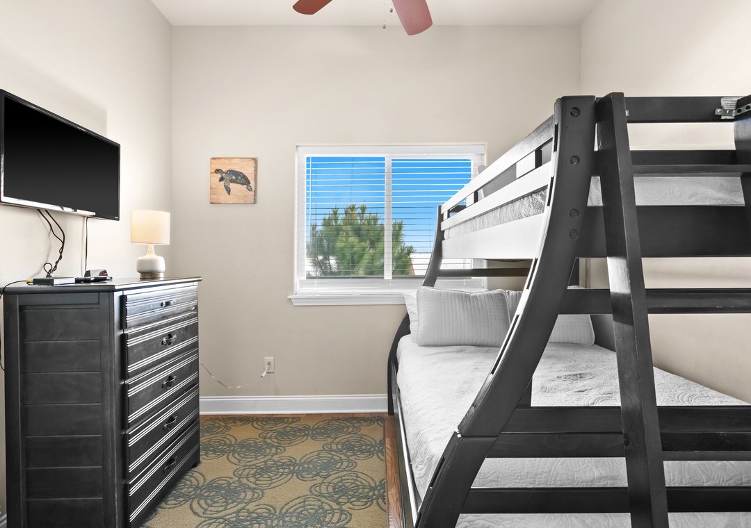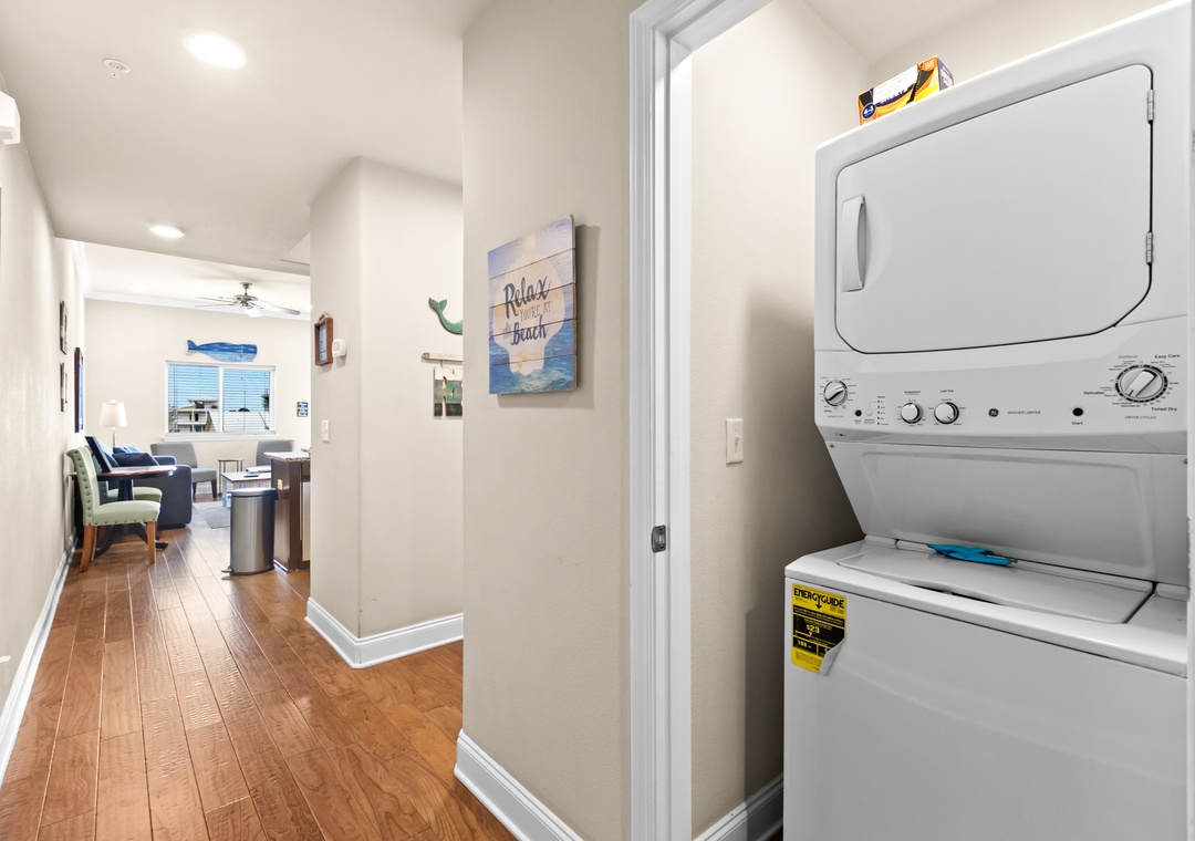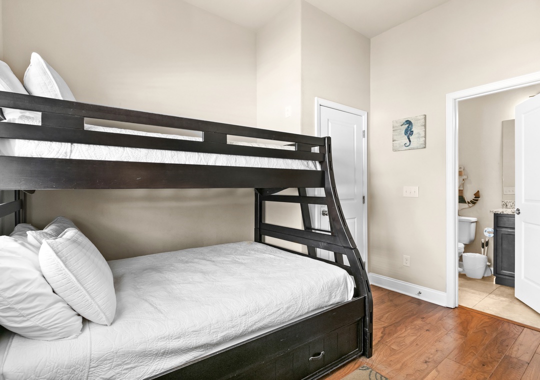 The primary suite features a king bed and ensuite bath with a walk-in shower, while the guest room includes a twin-over-full bunk bed with an additional twin trundle and an attached full bathroom—perfect for families or small groups. The unit also includes WiFi and a private washer and dryer for added convenience.