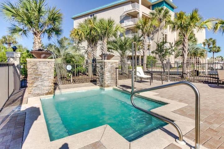 Alerio is a new complex featuring a community pool with a waterfall feature (seasonally heated), a hot tub with a waterfall feature, a grilling area, dancing fountains, and private beach access right across the street, and also an easy walk to Surf Hurt and Cabana Café.