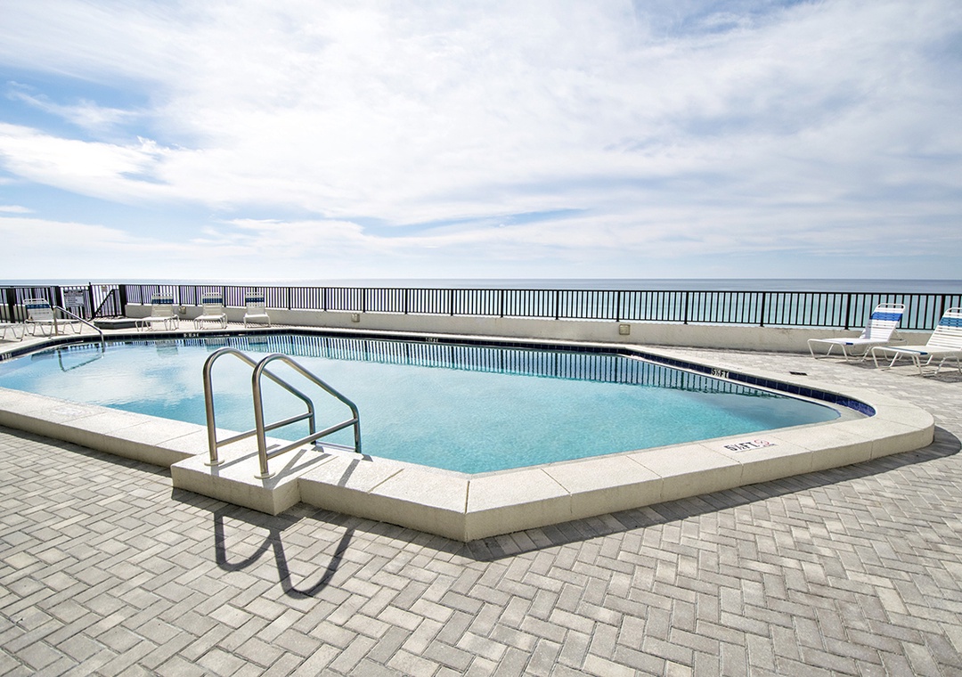 * Gulf-front pool, hot tub, elevated sundeck, and clubhouse.