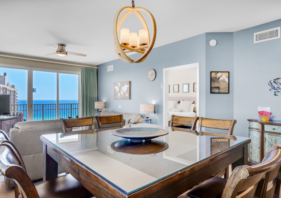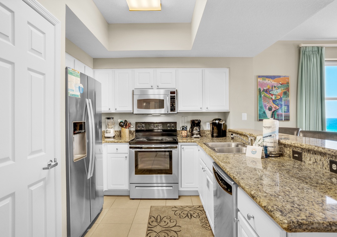 Recently updated, Ariel Dunes I 1401 is an upscale, corner condominium with breathtaking views of the Gulf of Mexico and the surrounding area from the fourteenth floor! The living area offers high-end furnishings, beautifully coordinated chairs, a glass top dining table for eight, eat-in kitchen with three barstools, and a large flat-screen TV with a DVD player. The fully equipped kitchen has beautiful cabinetry, stainless steel appliances, granite countertops, and all the housewares and appliances you will need for meal preparation. The master bedroom features a king bed, designer bedding, a flat-screen TV with a DVD player, and private balcony access; the master bath has a fabulous garden tub, separate glass-enclosed shower, and dual vanity sinks. The second bedroom offers a king bed with beautiful bedding, a flat-screen TV, and access to a full bathroom with a shower/tub combo and single vanity. The third bedroom is a second master bedroom with a queen bed and gorgeous bedding, and access to a private balcony with breathtaking views of the golf course, the coastline, and Choctawhatchee Bay. This bedroom also has a private bathroom with a shower/tub combo. There is a full-size washer and dryer for your convenience. Make your luxury stay at Ariel Dunes I, Unit 1401!