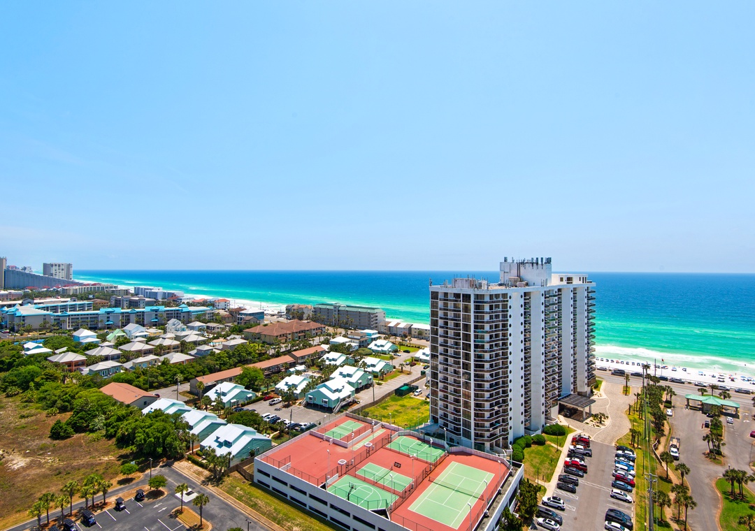 Ariel Dunes offers 24 stories of amazing views that span the sugar white sands and emerald green water of the coastline. The building is angled slightly to the west, and the sunsets are incredible! From the rear of the building, you get a bird's eye view of the lush Seascape Golf Course and the sparkling Choctawhatchee Bay.