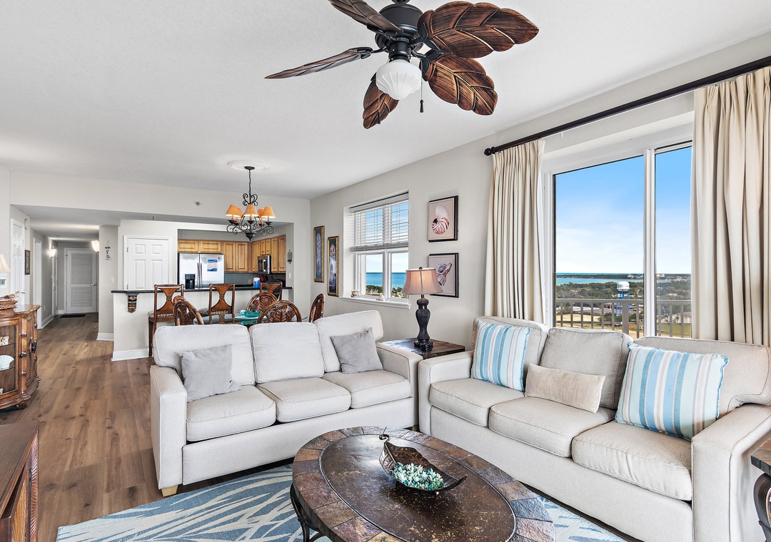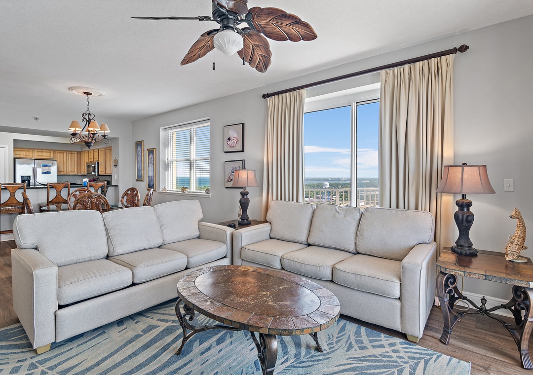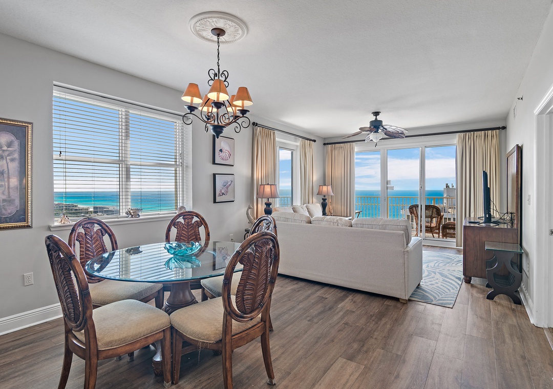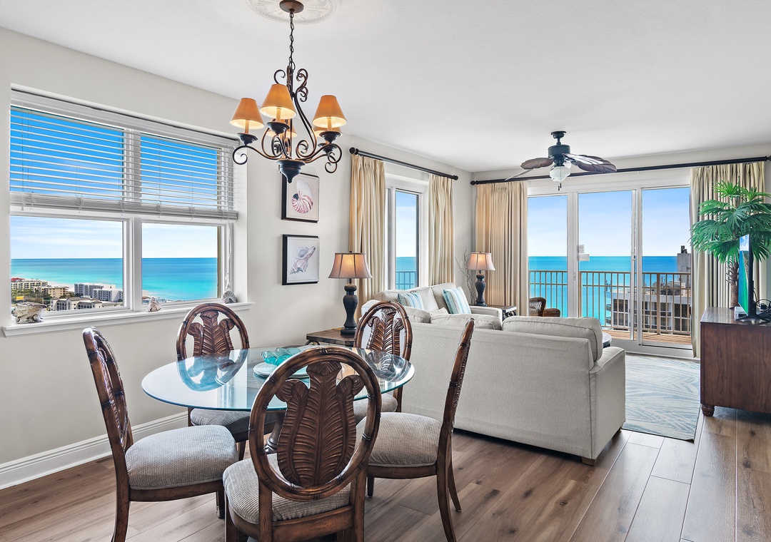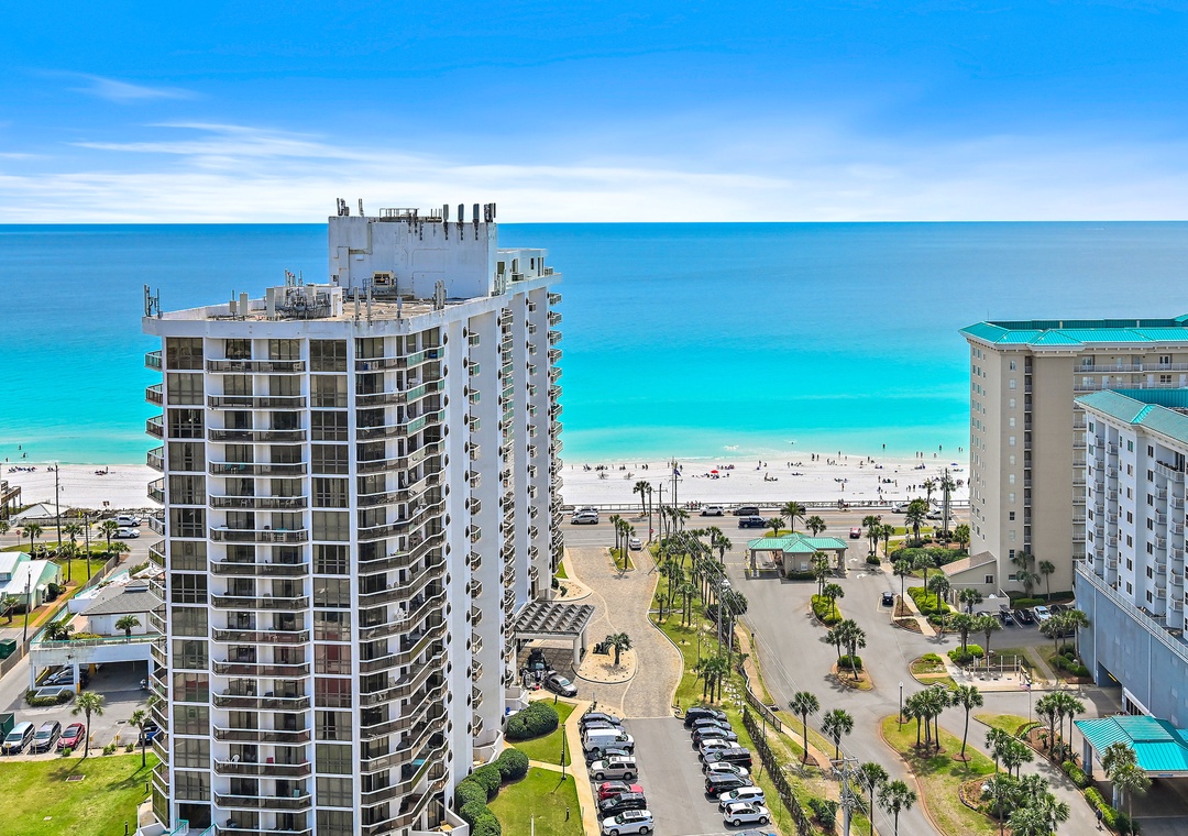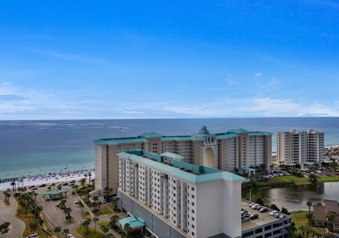 Ariel Dunes offers 24 stories of amazing views that span the sugar white sands and emerald green water of the coastline. The building is angled slightly to the west, and the sunsets are incredible! From the rear of the building, you get a bird's eye view of the lush Seascape Golf Course and the sparkling Choctawhatchee Bay.
