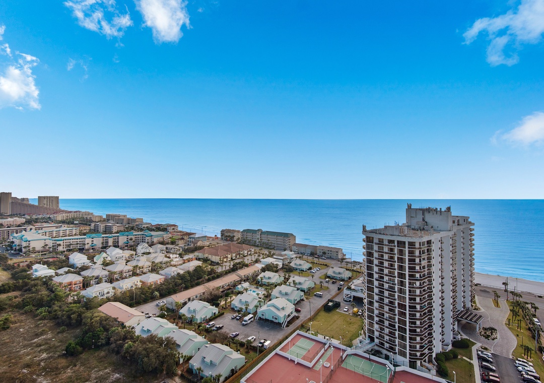 Ariel Dunes offers 24 stories of amazing views that span the sugar white sands and emerald green water of the coastline. The building is angled slightly to the west, and the sunsets are incredible! From the rear of the building, you get a bird's eye view of the lush Seascape Golf Course, and the sparkling Choctawhatchee Bay.