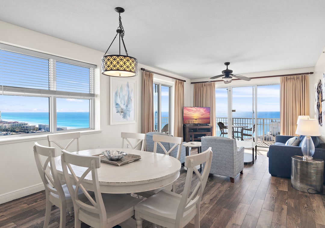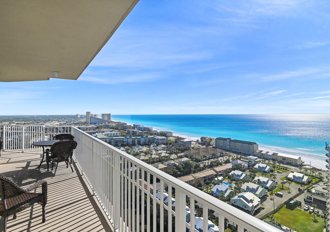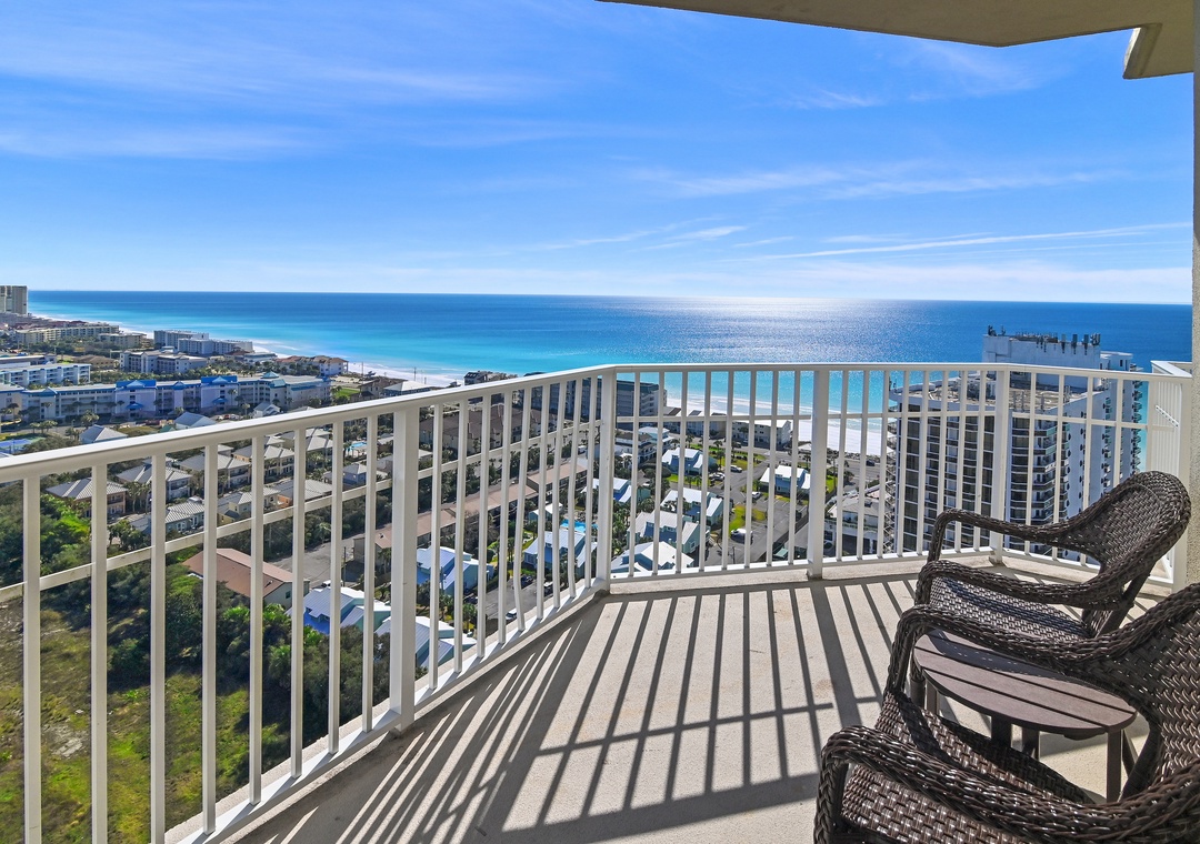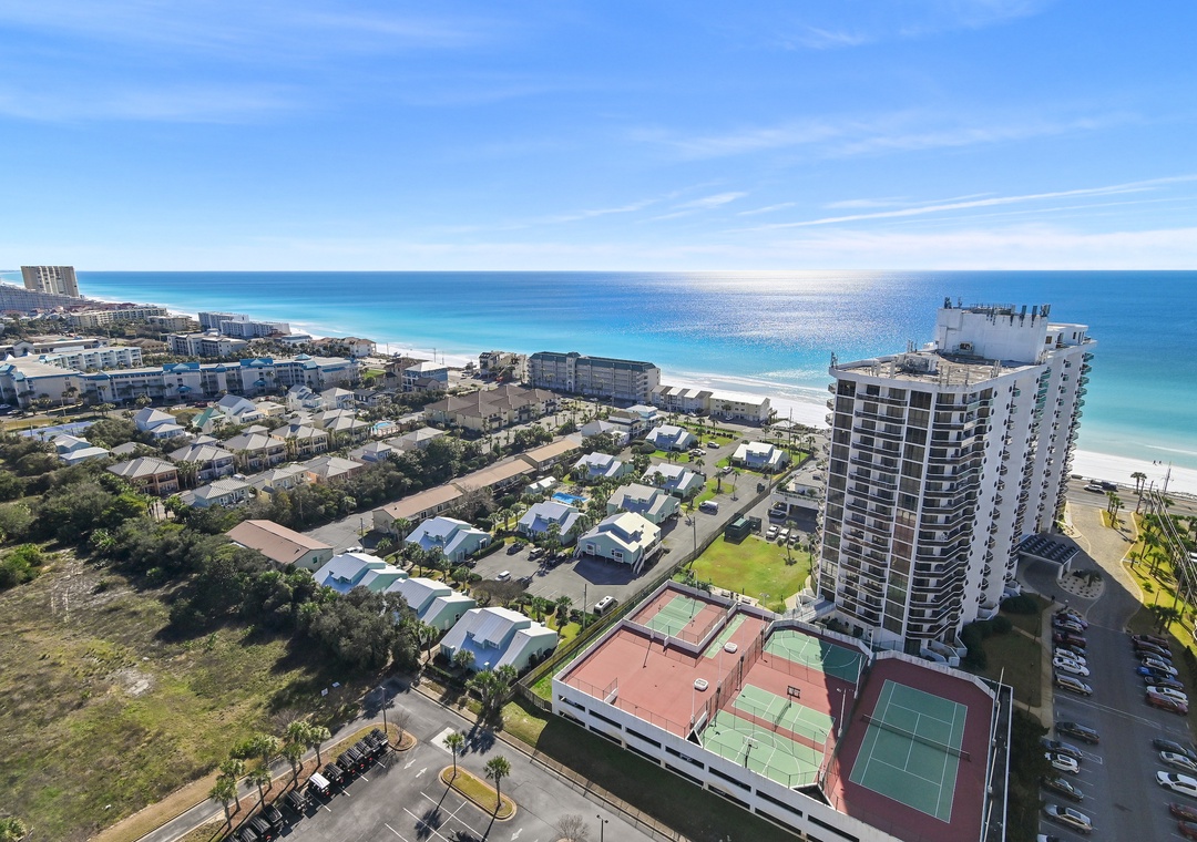 Ariel Dunes offers 24 stories of amazing views that span the sugar white sands and emerald green water of the coastline. The building is angled slightly to the west, and the sunsets are incredible! From the rear of the building, you get a bird's eye view of the lush Seascape Golf Course and the sparkling Choctawhatchee Bay.