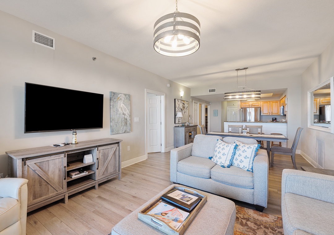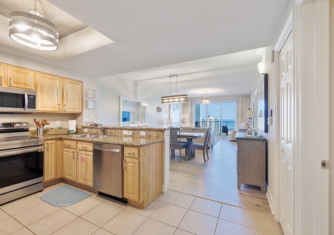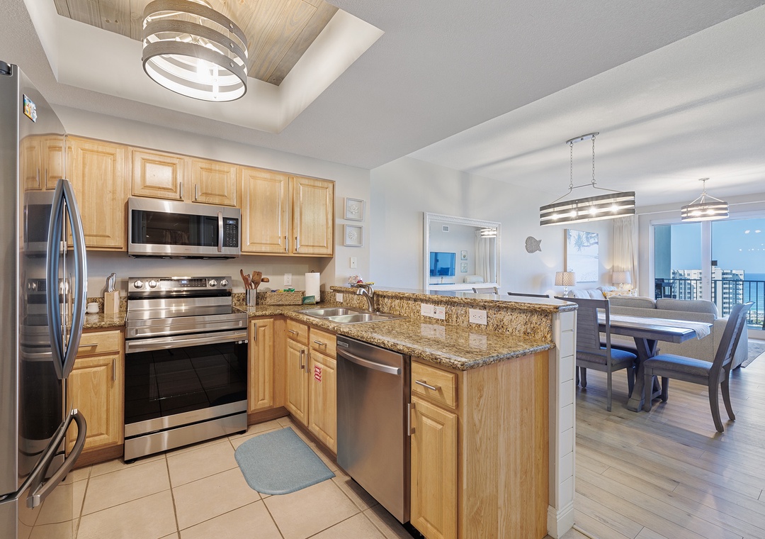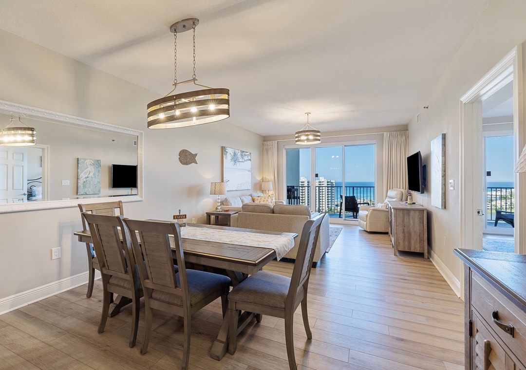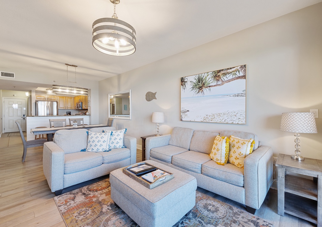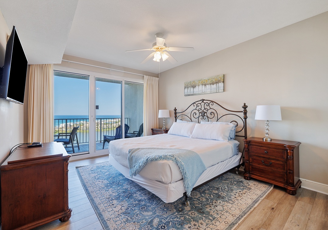 Welcome to Ariel Dunes II 1308, a stunning 13th-floor retreat offering breathtaking panoramic views of the Gulf and the nearby coastal lake. This beautifully appointed condo is designed for comfort and relaxation, featuring a spacious king master suite with private balcony access where you can wake up to spectacular water views each morning. The master bathroom includes a walk-in shower and a relaxing soaking tub for the perfect end to a day at the beach. A guest bedroom with a queen bed and a sleeper sofa in the living room allows the condo to comfortably accommodate up to six guests. The fully equipped kitchen provides everything you need to prepare a delicious meal, whether you’re cooking for the family or enjoying a quiet evening in. Start your day with coffee on the balcony while taking in the incredible scenery, then head down to the beach or keep up with your routine in the on-site fitness center. For added convenience, the condo also includes an in-unit washer and dryer. Ariel Dunes II 1308 is the perfect place to relax, recharge, and experience an unforgettable Gulf Coast vacation.