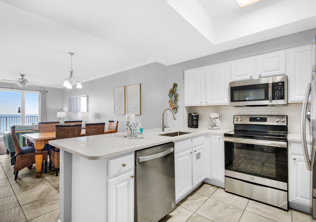 Kerri, we are very happy to know that you found this three-bed, two-bath Ariel Dunes II unit to be clean and the living area spacious and you loved sitting on the balcony. We apologize for any inconvenience caused by the Keurig system not working properly. We are glad that another coffee system was on hand to use. Thank you for using Real Joy.Real Joy staff
