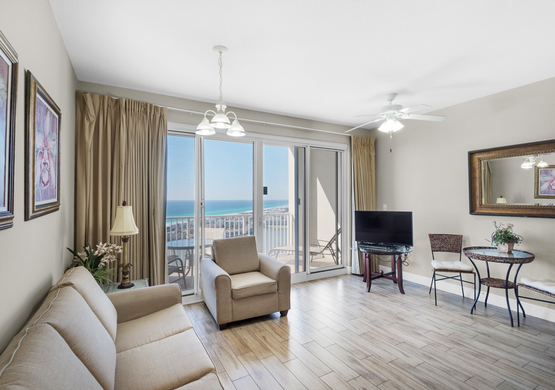 Enjoy sweeping coastline views from the private, 20th-floor balcony of Ariel Dunes II 2006! This 1BR+Bunks/1.5BA condo offers a spacious living area with hardwood flooring, a fully equipped kitchen boasting granite counters, and a breakfast bar. With a king bed in the master bedroom, twin bunk beds in the hallway, and a sleeper sofa in the living room, this elegant condo sleeps 6 guests comfortably! Savor your morning coffee on the balcony and soak in the spectacular gulf views, splash around in the multiple pools, warm up in the sauna, and explore the abundant amenities at Seascape Resort. Check out why Ariel Dunes II 2006 is a family favorite!