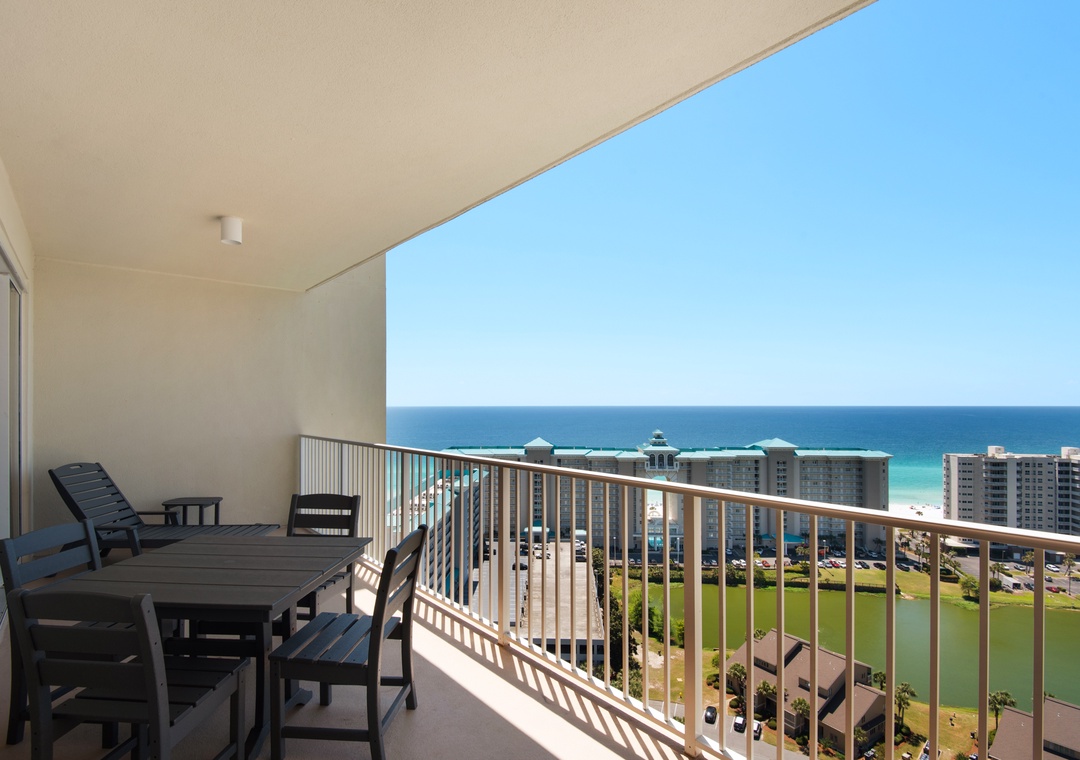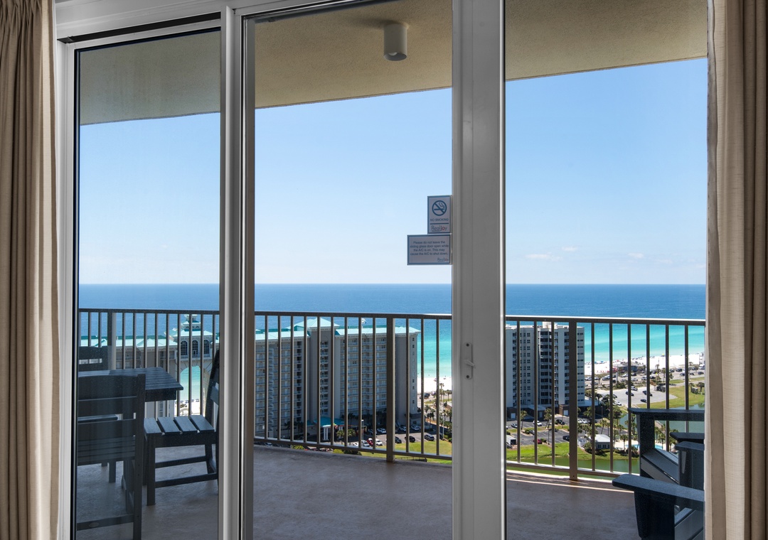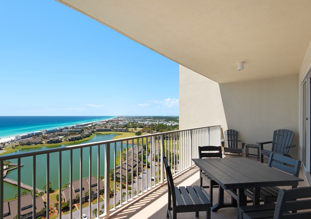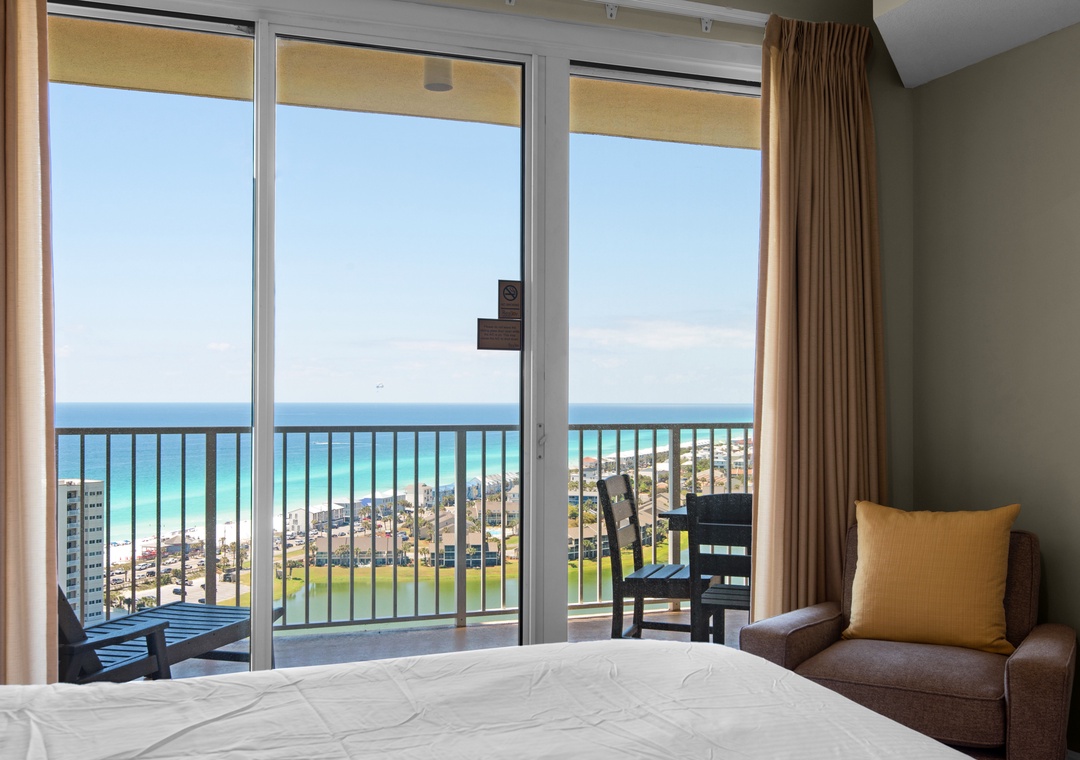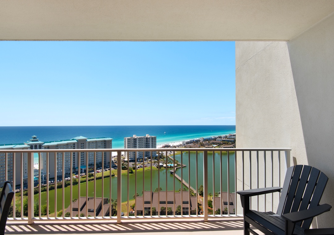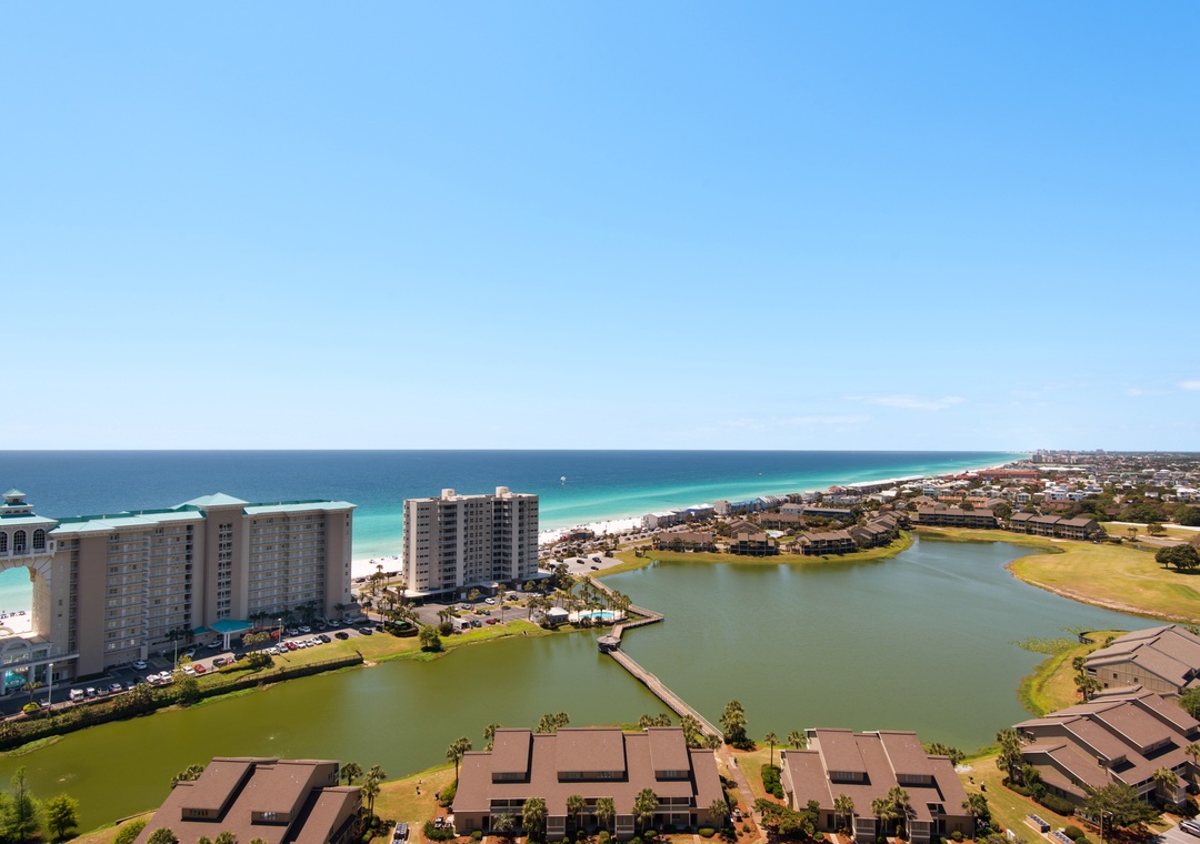 Welcome to Son-Sent Blessings II at Ariel Dunes, where you'll enjoy breathtaking panoramic views of the bay from the front door, stunning coastline vistas, Emerald waves, and a tranquil lake seen from the balcony, living room, and master bedroom. The spacious master bedroom features a king-size bed with balcony access, while the luxurious en-suite bath offers a garden tub, separate shower, and double vanities. The guest bedroom includes 2 twin beds, and there is a sleeper sofa in the living room, making this condo perfect for a comfortable stay for up to 6 guests. Whether you're brewing your morning coffee or preparing a gourmet meal, the fully equipped kitchen has everything you need. Dive into the multiple pools, relax in the sauna, and take full advantage of Seascape Resort's fantastic amenities. Discover why Ariel Dunes II 2103- Son-Sent Blessings II is a family favorite!