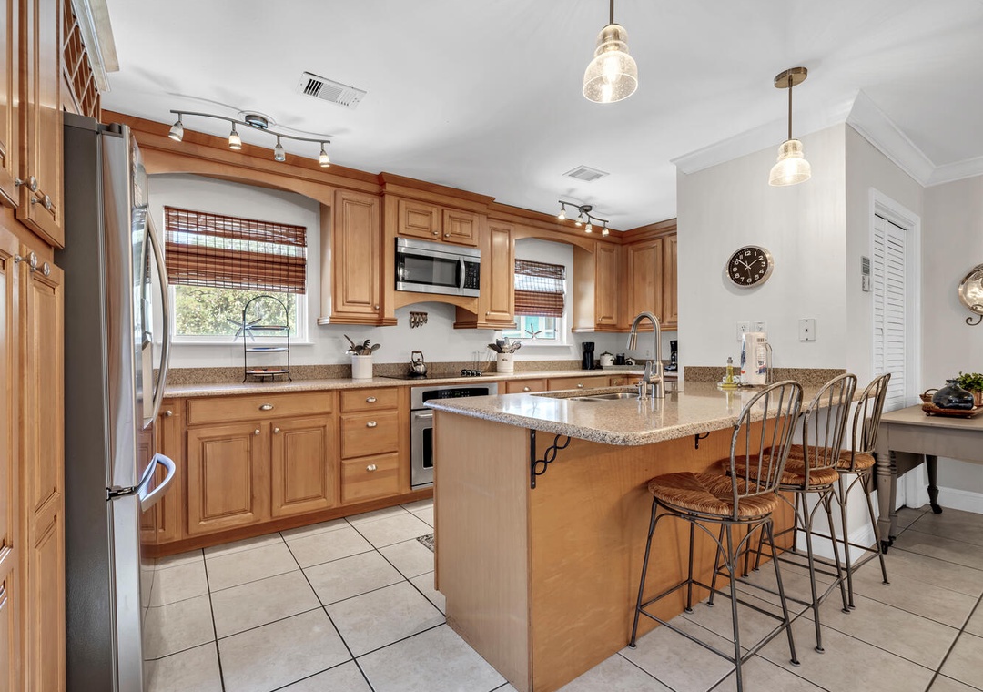 We appreciate you taking the time to provide us with some feedback regarding your vacation rental experience at Aweigh From Home. We are happy to know that you enjoyed this fabulous, spacious property, especially its two kitchens, very comfortable rooms, decks, pool, and great location; and the issue with the grill was promptly fixed. Thank you for choosing Real Joy.Real Joy staff