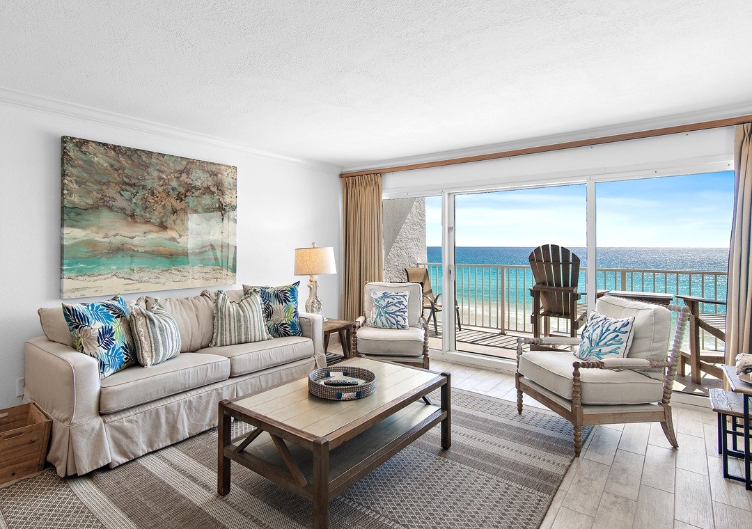 Kick back and relax in Rest Ashore, a fabulous 2 bedroom, 2 bath, Gulf Front condo at Beach House in Miramar Beach! This Penthouse level unit features travertine tile throughout the living areas, granite, and lovely tile-work in both bathrooms. With a king bed in the master, two full beds in the guest bedroom, and a sofa sleeper in the living room, this lovely condo sleeps 6 guests comfortably! There is a washer/dryer for your convenience. Drink in beautiful gulf views from the balcony, or check them out from the living room or kitchen. Make Rest Ashore your go-to beach destination!