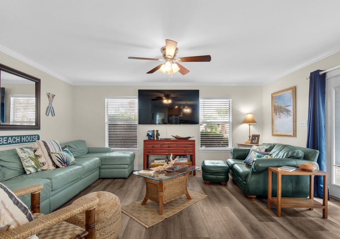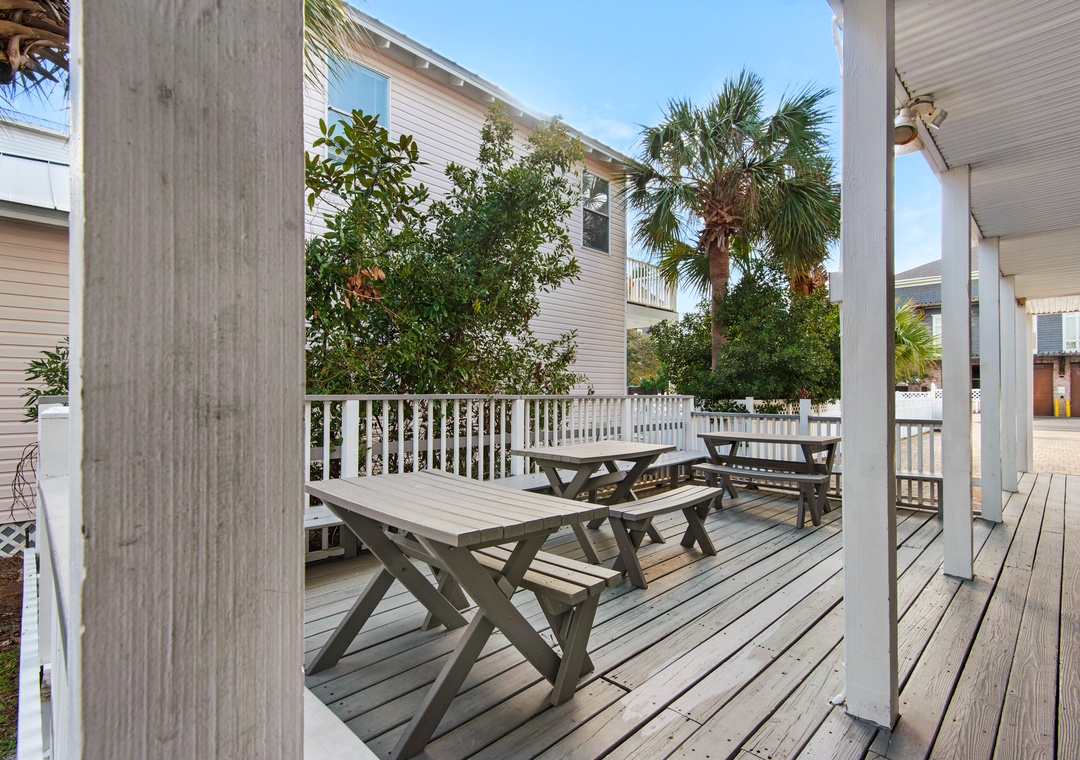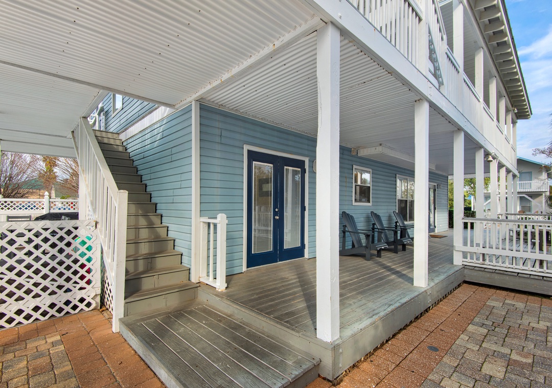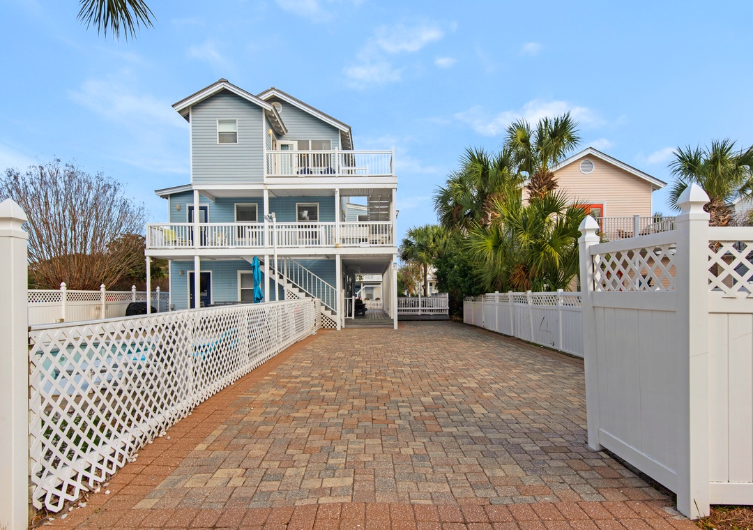 The living area on the main floor has brand new La-Z-Boy furniture. The downstairs bedroom is perfect for those guests who are unable to climb stairs. Most bedrooms have access to the wraparound porches and there are interior and exterior stairs providing access to the second and third level without going through the first floor. The exterior stairs are recommended for loading and offloading suitcases. There is plenty of off-street parking, which can be difficult to find at the beach. Five cars can fit into the driveway, and two large or three small vehicles can fit along courtyard on the east side of the house.