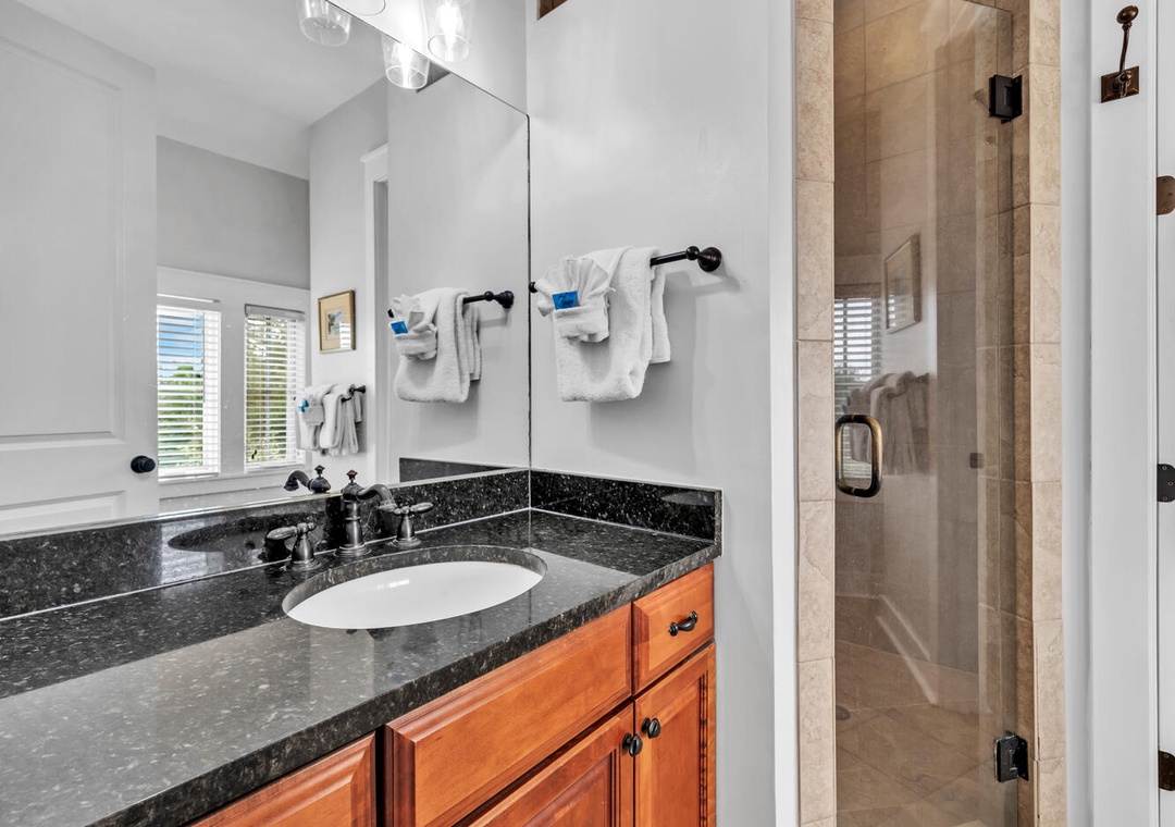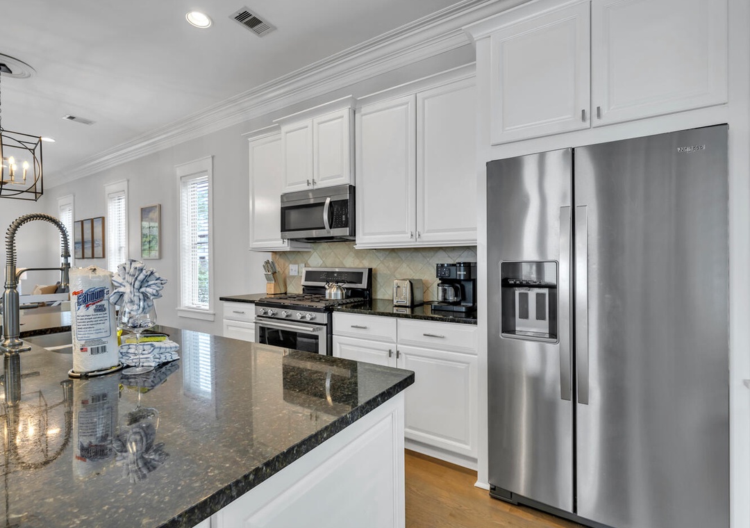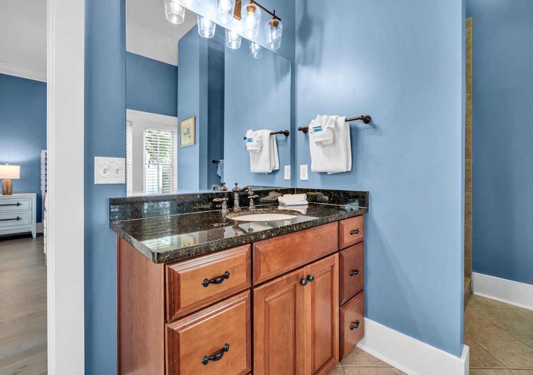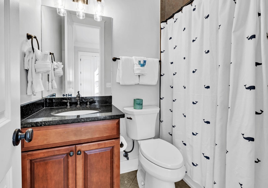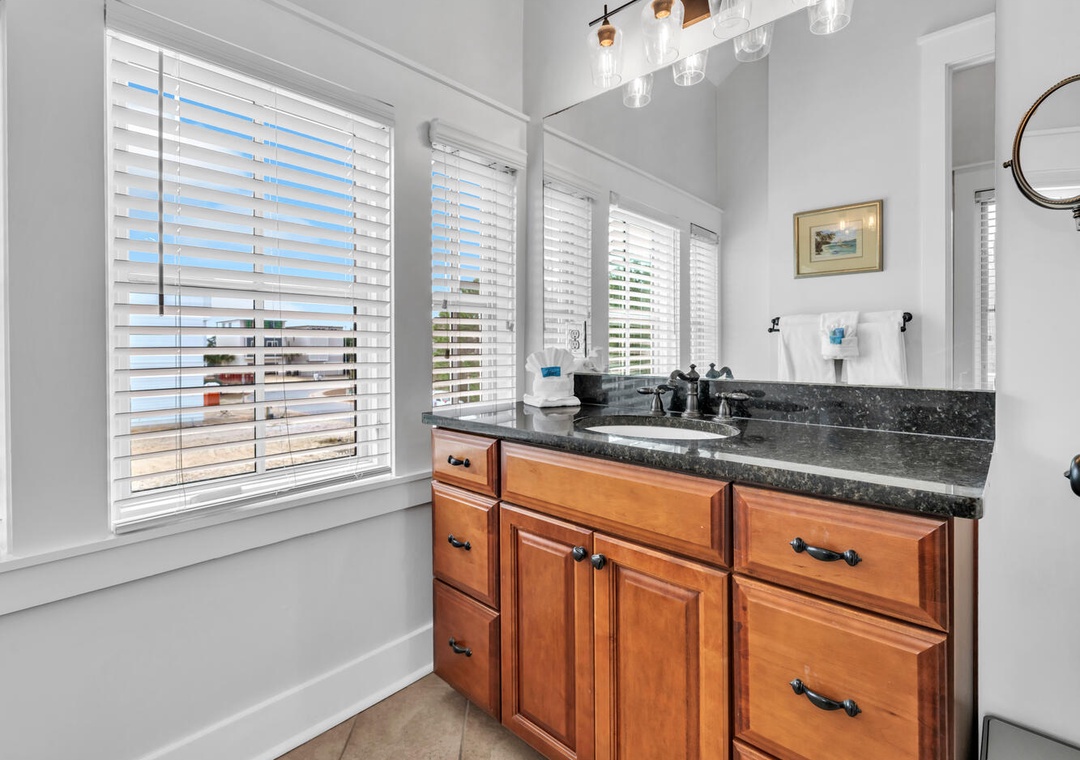 The family chef will delight in the well-equipped kitchen, ideal for whipping up delicious meals. Start your day with a cup of coffee on the porch, soaking in the view. Upstairs, two master suites feature king beds, while the guest room boasts two twin bunk beds. Each king bedroom includes an en suite bath, ensuring privacy and convenience for everyone.