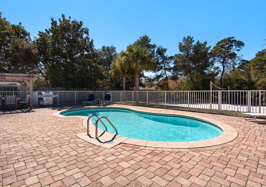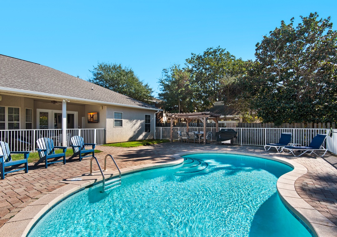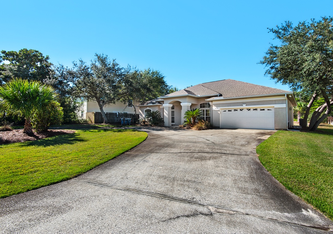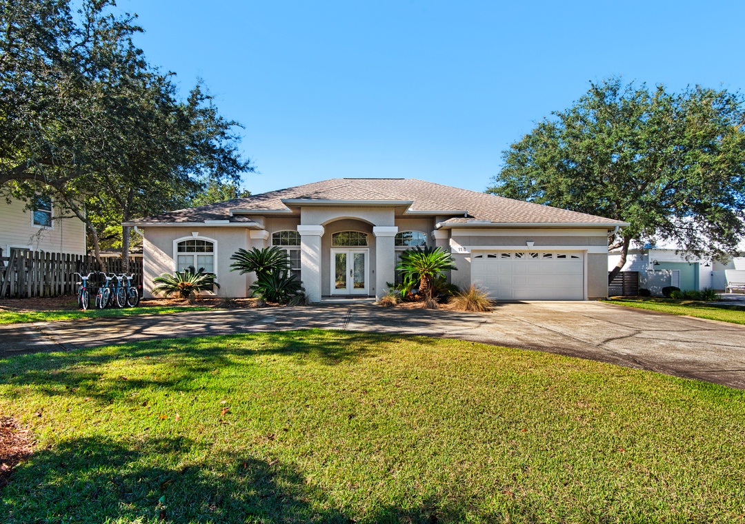 Welcome to Beach Retreat, your ideal home away from home in the Gulf Pines neighborhood of Miramar Beach. This spacious 4-bedroom, 3-bathroom home offers comfort and convenience for up to 14 guests. Explore the neighborhood or head to the beach using the provided Low Speed Vehicle (LSV) and bikes. The well-equipped kitchen is ideal for preparing everything from morning coffee to family meals. The master suite features a king bed with direct access to the patio and pool. Guest Bedroom 1 includes two sets of twin-over-twin bunks, perfect for kids, while Guest Bedrooms 2 and 3 each offer cozy queen beds. Additionally, both the sitting/office area and living room include a sleeper sofa for extra guests.