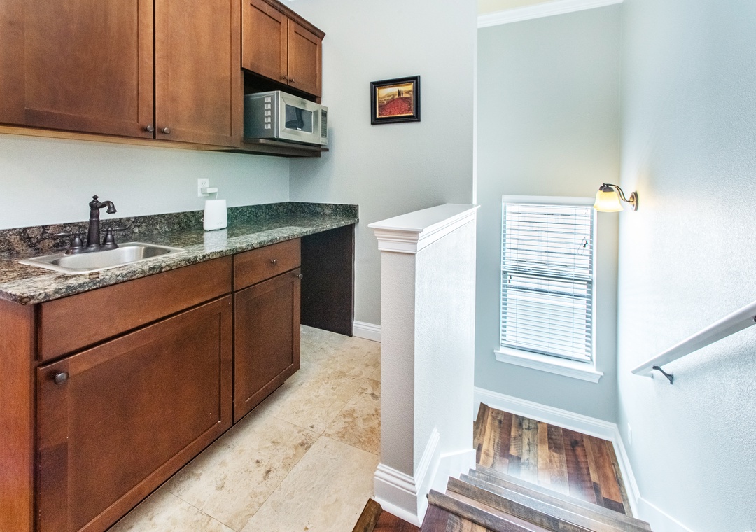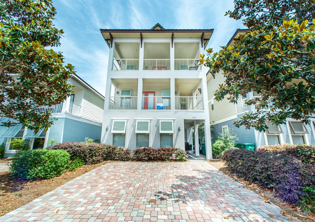 Beach Rx is a beautiful 5BR/4BA, 3-story home located in the exclusive Villages of Crystal Beach neighborhood. The first floor boasts 10-foot ceilings and 8-foot doorways and features a fully equipped kitchen with granite countertops, custom cabinets, stainless steel appliances, and a large dining table plus breakfast bar. There is a king bedroom on the first floor, a queen bedroom and a king master suite on the second floor, a bedroom with 2 queen beds and a bedroom with a twin over full bunk bed on the third floor along with a second living space with a queen-sized sleeper sofa, allowing sleep accommodations for up to 14 guests. The master suite also features a private kitchenette/wet bar, a flat screen TV, balcony access, and an ensuite with a corner Jacuzzi tub! Enjoy your refreshments on the two balconies or relax comfortably in one of the two living rooms. This luxurious community is about 900 yds from Crystal Beach and includes a complimentary seasonal trolley service to take you to and from the Gulf!