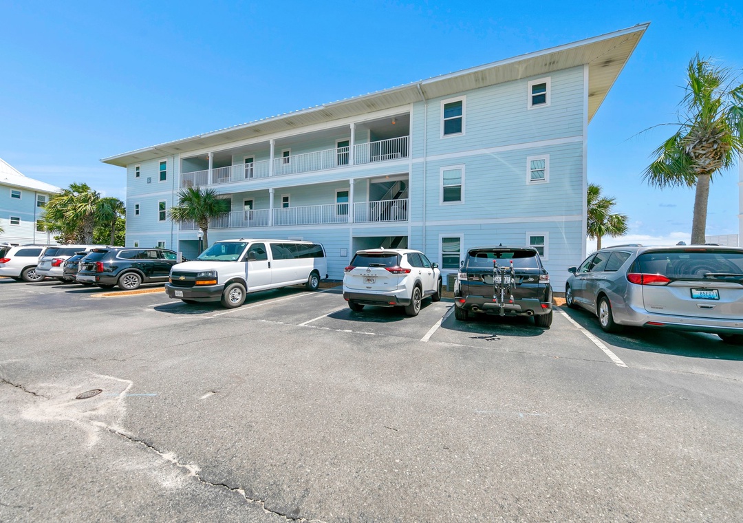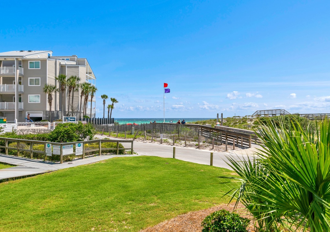 One at the end of San Roy Rd and the other at Walton Dunes Access. Beach service is available at Walton Dunes Access. We do not recommend using the beach access by building 6 due to the security guard posted by Sugar Dunes and the private homes. Guests should be made aware that this access is intended solely for reaching the Gulf. To set up on the beach, they will need to walk west past the private homes or east past Sugar Dunes.