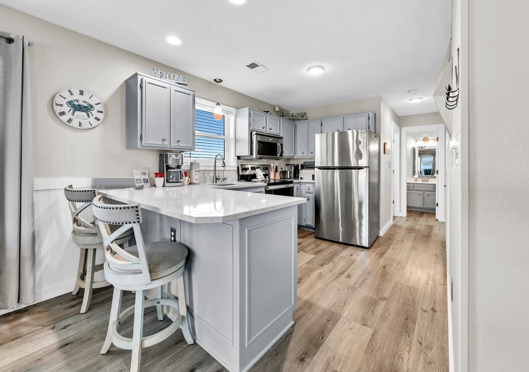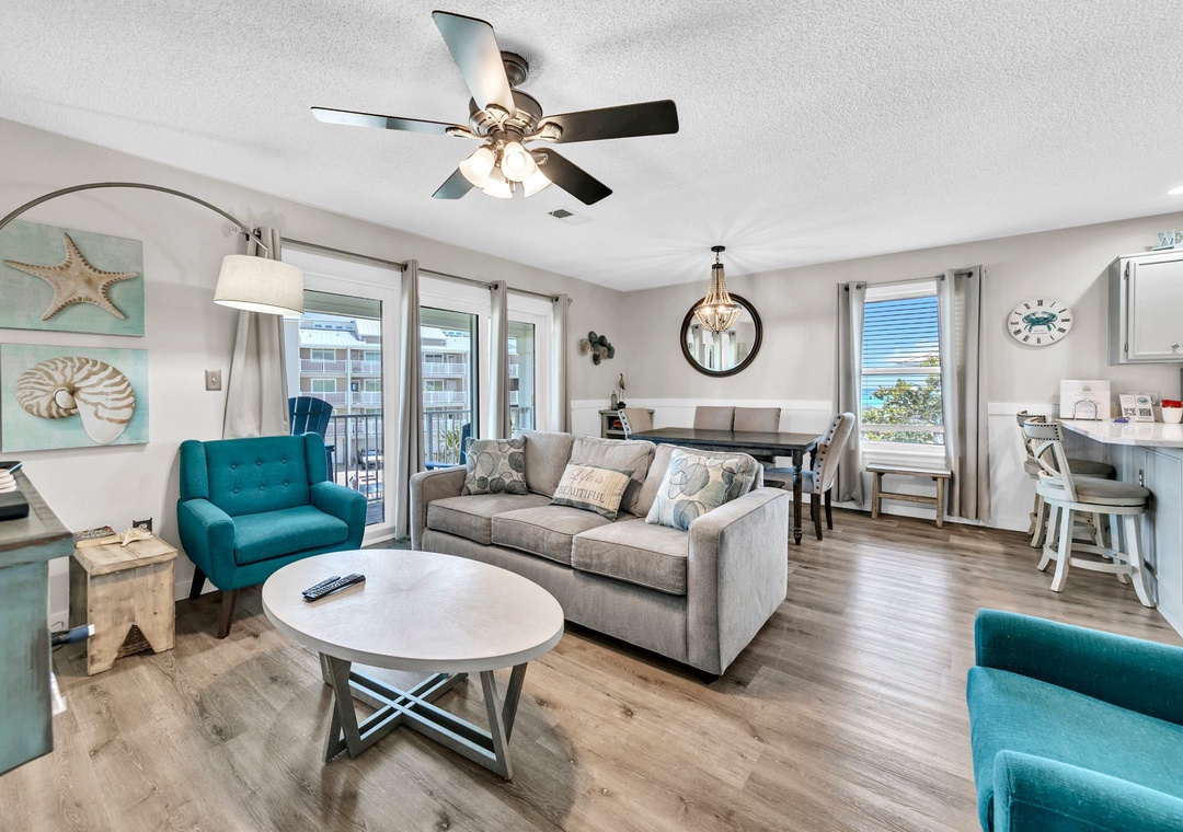 Located on the third-floor corner unit, you will find that at Sweet Spot, you have some of the best views in Seagrove! The master bedroom offers a King Bed, and a flat screen TV, a private bathroom and a view of the ocean from your bed. The second guest bedroom offers a Queen Bed as well as a Smart TV. The third guest bedroom offers a Full and Twin Bed and a flat screen Smart TV, allowing the condo to spaciously sleep up to 7 guests.