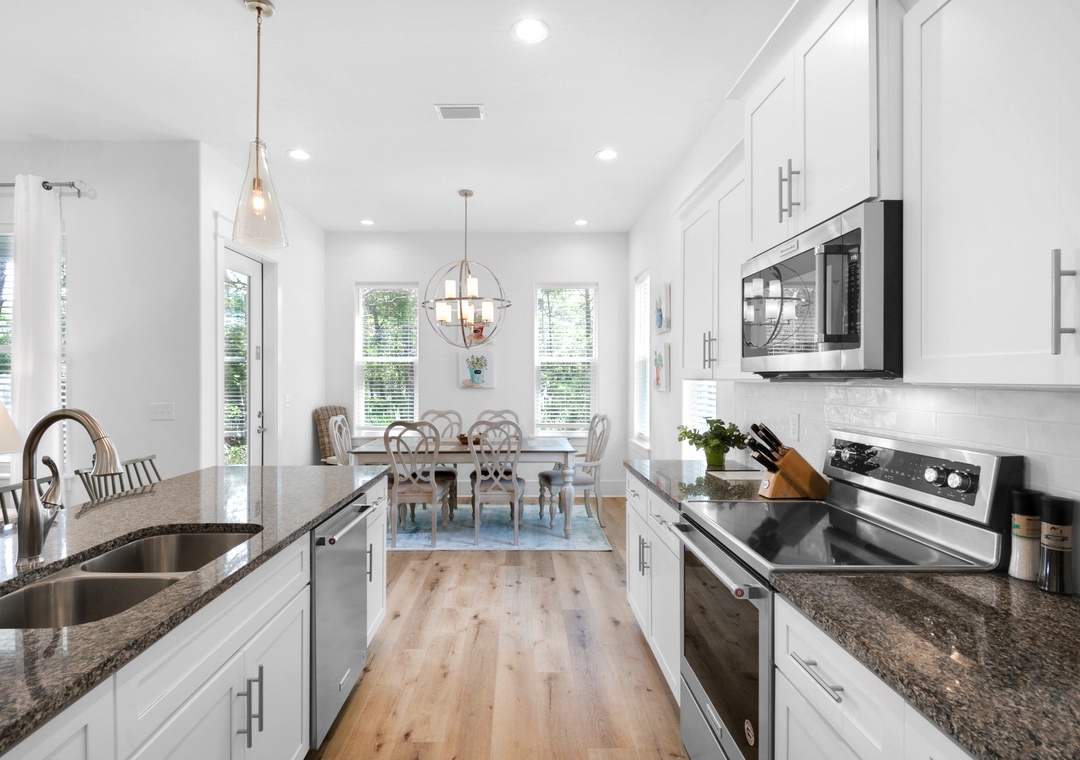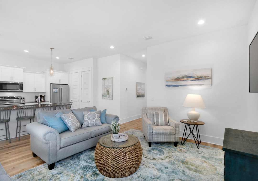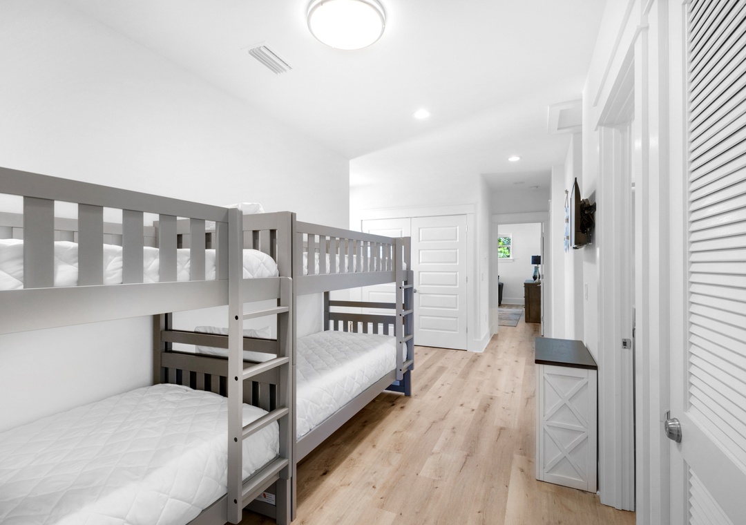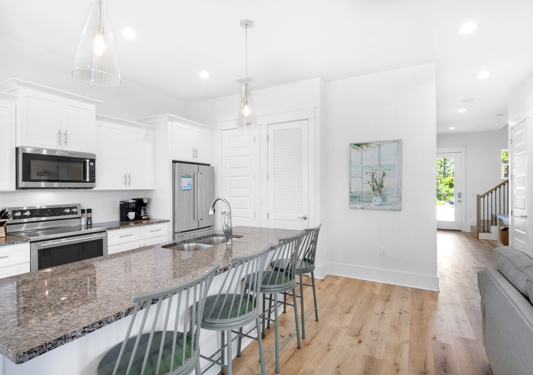 Welcome to Bella Blue, a stunning 4-bedroom, 4-bathroom retreat located in the charming Villas of Frangista. This beautifully furnished home features an inviting full kitchen with granite countertops, a spacious island, hardwood floors throughout, and sleek stainless-steel appliances. On the first floor, you’ll discover a comfortable guest bedroom with a king bed and a cozy living room equipped with a sleeper sofa. Ascend to the second floor, where you’ll find an exquisite king master suite complete with its own sleeper sofa, a luxurious ensuite bathroom boasting double vanities, a walk-in shower, and a separate soaking tub. This level also offers two additional guest rooms—one with a king bed and the other with a queen bed—plus a delightful loft featuring two twin-over-twin bunk beds, perfect for kids or extra guests.