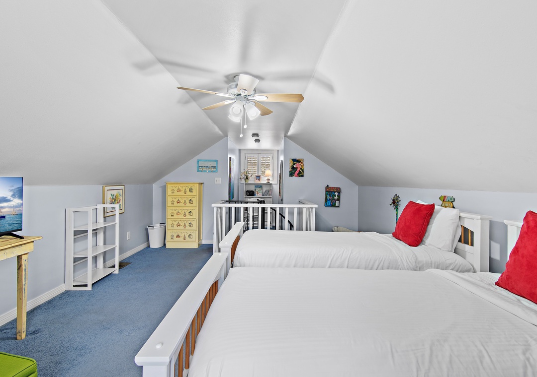 Step into Best Nest, a charming beach retreat surrounded by a classic white picket fence in Crystal Beach. This inviting 3-bedroom, 2-bath home comfortably sleeps up to six guests and is designed for easy coastal living. The first floor features a spacious primary bedroom with a king bed and a guest bedroom with two twin beds. Upstairs, the open loft offers two additional twin beds—perfect for kids or extra guests. Start your mornings on the front porch, sipping coffee while relaxing on the porch swing. After a day at the beach, rinse off in the outdoor shower before kicking back in the garage hangout space, complete with foosball, a TV, and room to unwind with your favorite beverage. The fully equipped kitchen makes it easy to prepare delicious meals, which you can enjoy indoors or dine outside while soaking in the peaceful seaside atmosphere. Best Nest is the perfect spot to relax, recharge, and make lasting beach memories.