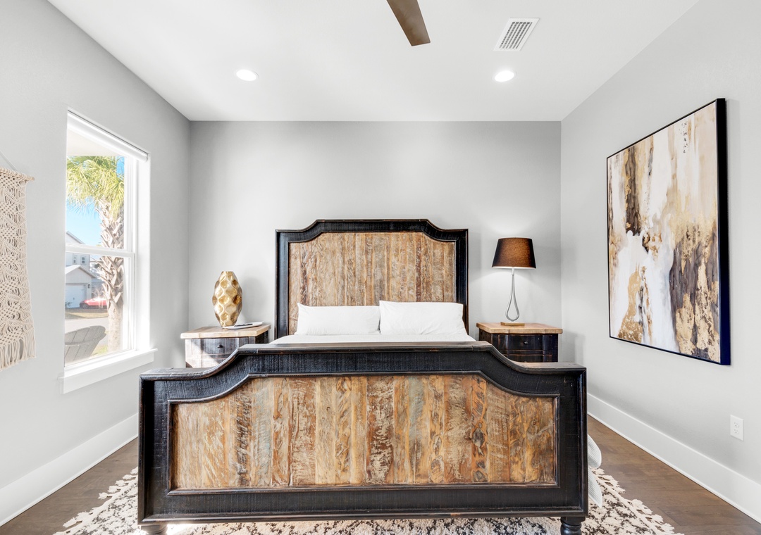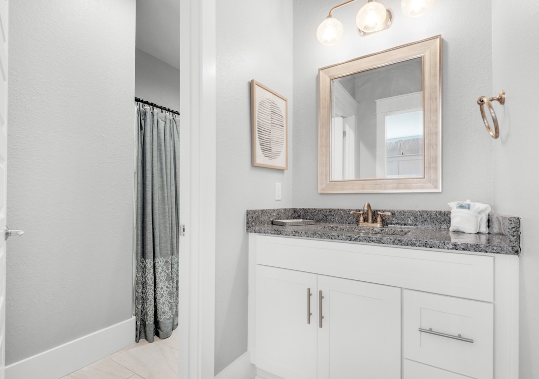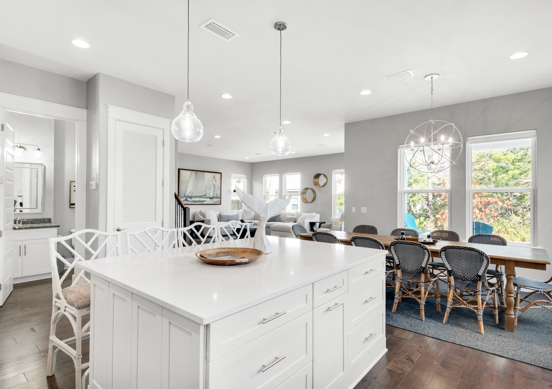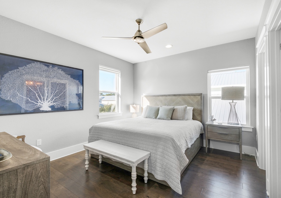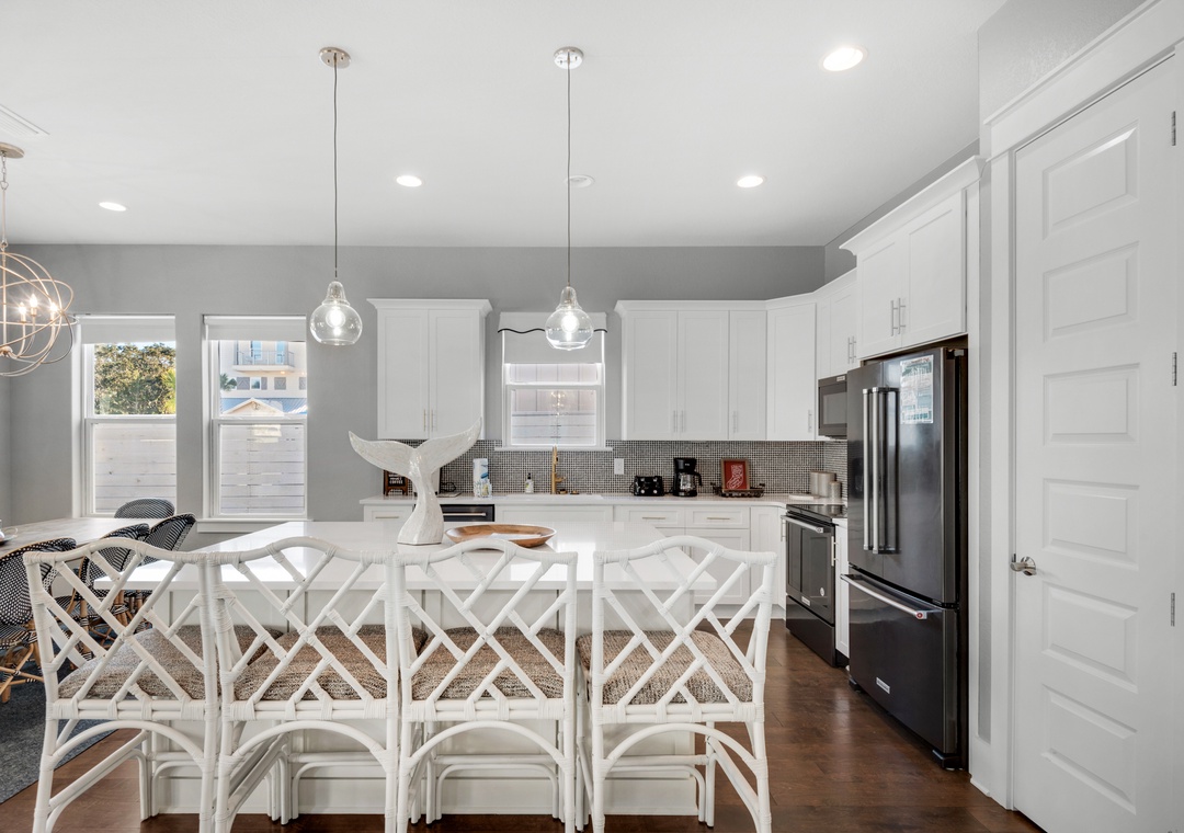 Located in Villas of Frangista, Bikini Bottom is a 4BR, 3.5BA beautifully furnished beach home, complete with a gourmet kitchen, hardwood floors throughout, granite countertops with a large island, stainless steel appliances, and two master bedrooms! The downstairs king master suite has a private sitting area and en suite bathroom with double vanities, a walk-in shower, and a separate soaking tub. Additionally, there is an upstairs king master, a guest room with a queen bed, and a guest room with a queen over-queen bunk bed with a twin trundle, sleeping up to 11 guests comfortably! When not enjoying the beach, take a stroll to the community pool only a couple of blocks away. Come have the vacation of a lifetime at Bikini Bottom! Please note that the golf cart in the garage is not available for guest use, and there is not enough space to park a vehicle; however, guests are welcome to use the beach chairs, wagon, trash can, and other accommodations in the garage.