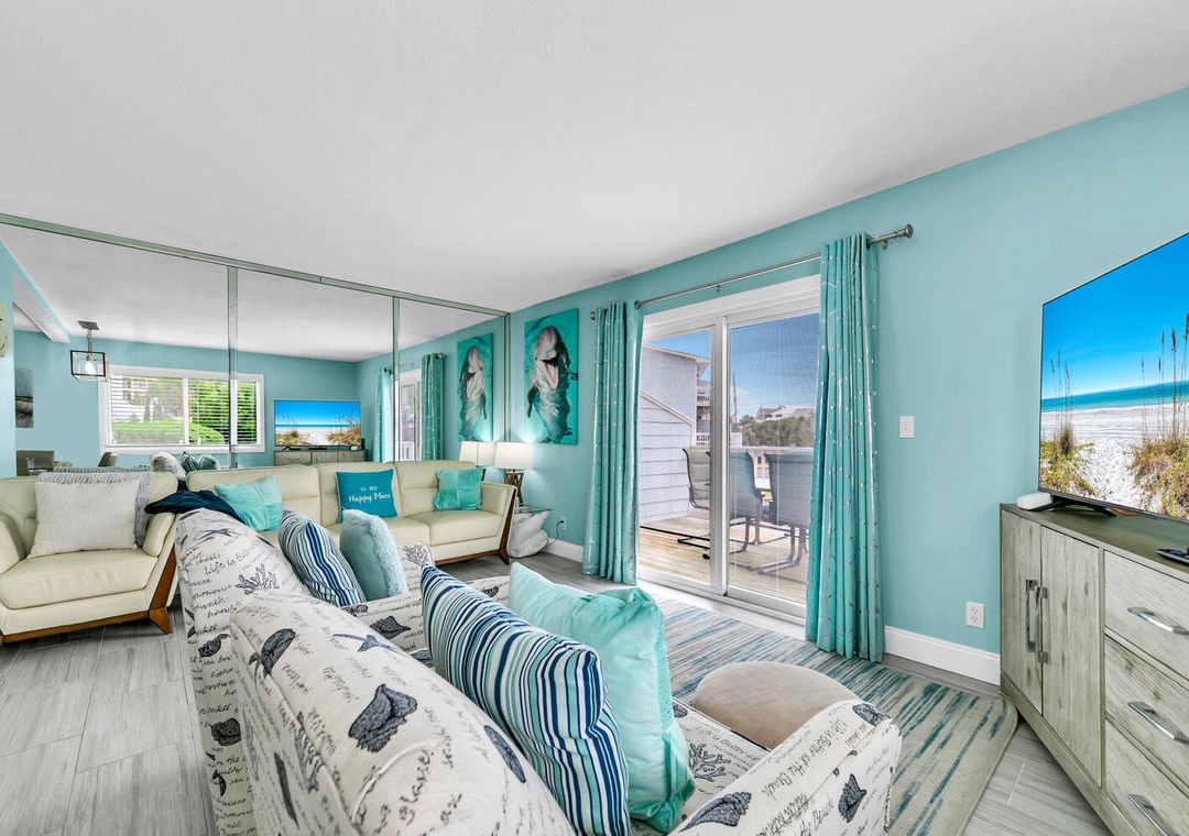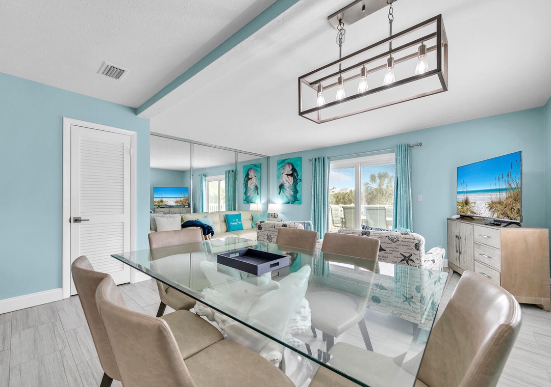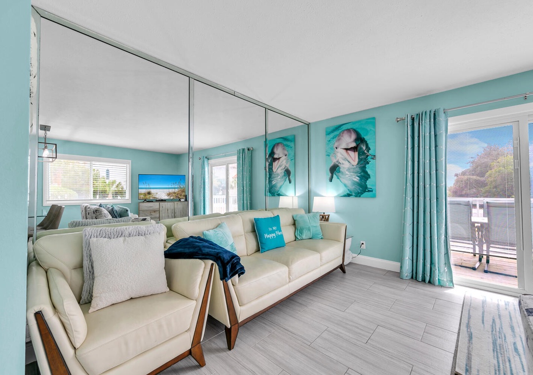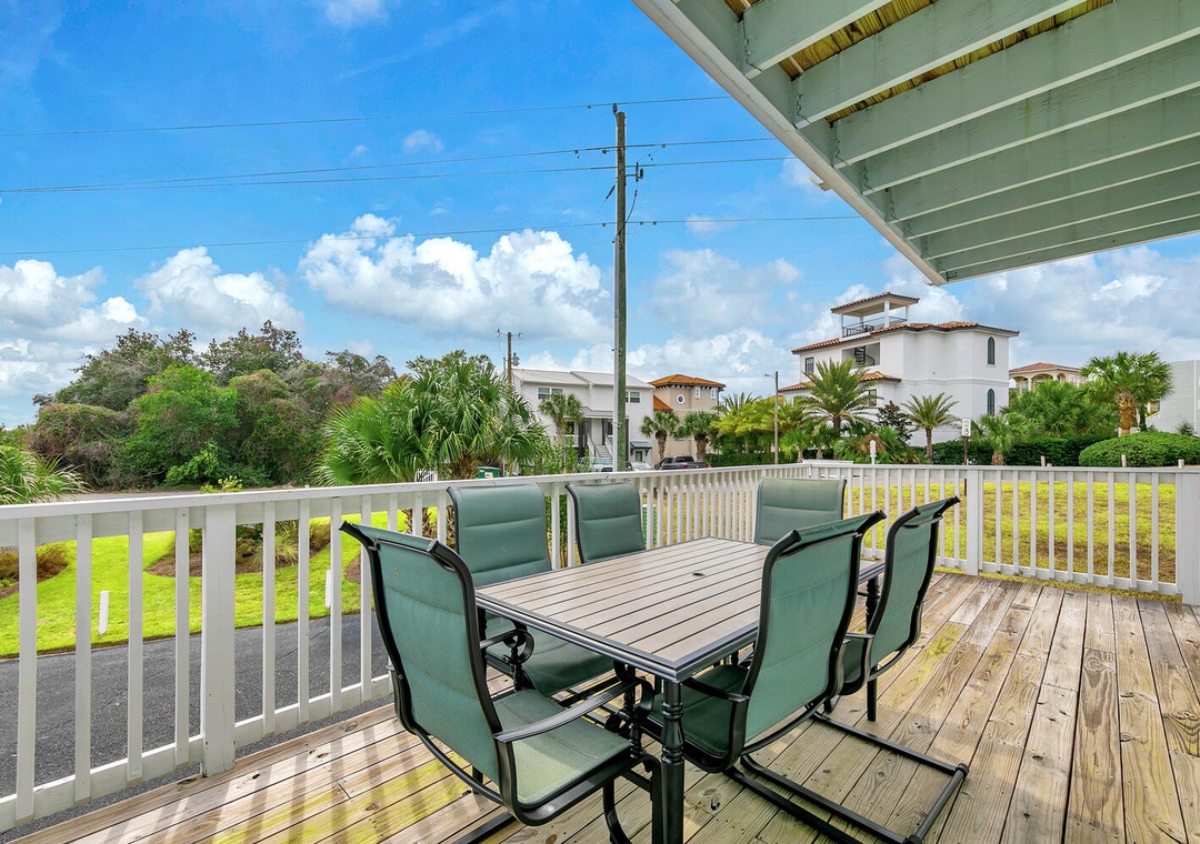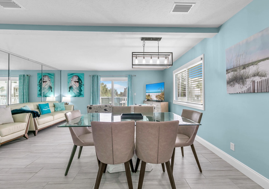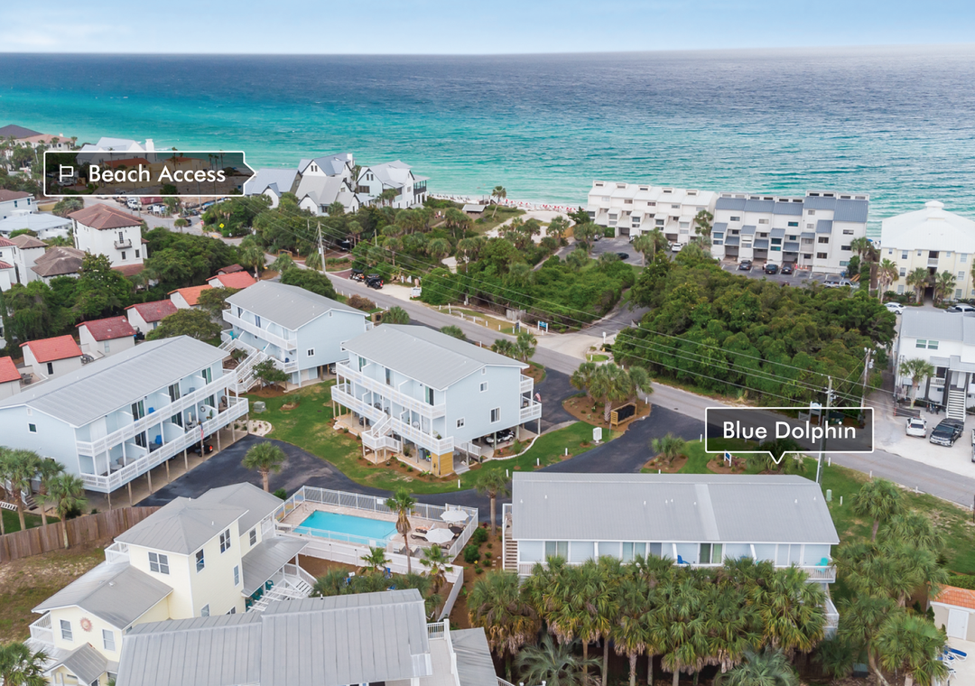 Welcome to Blue Dolphin, a charming 2-bedroom, 1.5-bath townhouse nestled in Sandcastles by the Sea, right in the heart of Blue Mountain Beach. This inviting retreat features an airy first-floor living area bathed in natural light, perfect for family gatherings. The well-equipped kitchen and large dining table create an ideal setting for culinary adventures and shared meals. Upstairs, unwind in the master bedroom with a king bed and private balcony access, or enjoy the guest bedroom, which includes a queen bed and twin bunk beds—accommodating up to 6 guests comfortably. Relax on the balcony with your favorite drink as you watch the sunset, or take advantage of the private courtyard, complete with an outdoor shower to rinse off after a day at the beach. Come create unforgettable memories at Blue Dolphin!