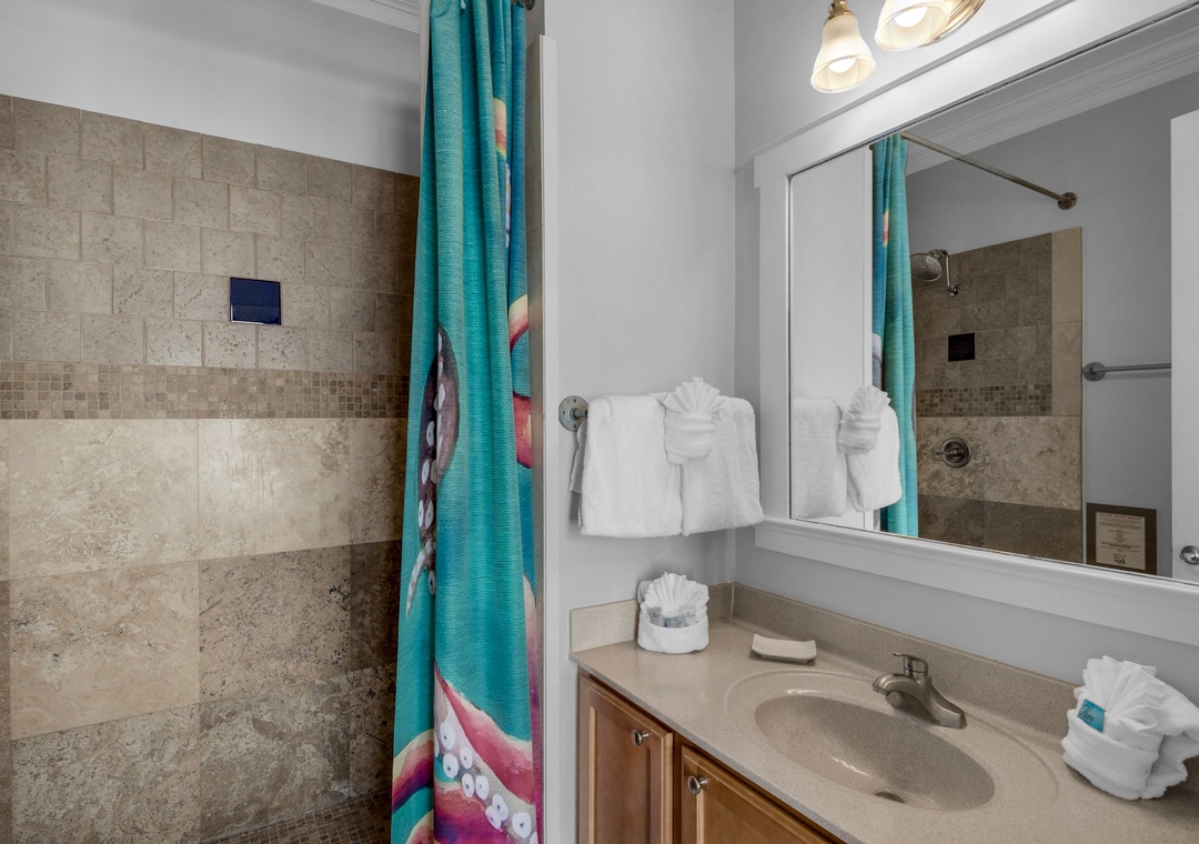 Catch the wind and find Blue Mountain Breeze, a charming 4 bedroom, 3 bathroom home that is the perfect place for your next 30A beach getaway! This rental has a king master bedroom with ensuite bathroom and balcony, king guest room, queen guest room, a bunk room with two twin-over-twin bunk beds, a loft area with a twin-over-twin bunk bed, and a sleeper sofa in the family room, sleeping 14 comfortably. Step outside to the patio and enjoy the private, saltwater pool or cook up something delicious on the propane grill. This beautiful home is nestled in the SandCastles By the Sea community in a quiet cul-de-sac; only a short walk to several local dining spots, sugar white sands, and emerald waters. Blue Mountain Breeze will enthrall you with its charm and beauty, and give you a 30A vacation that will make you want to return here year after year.
