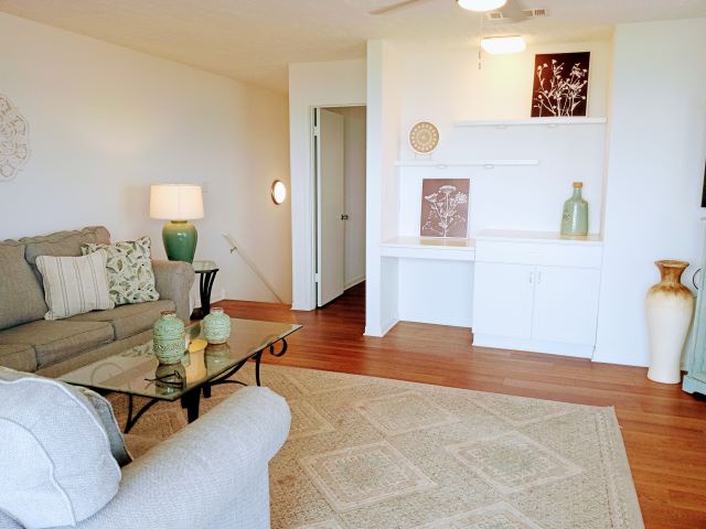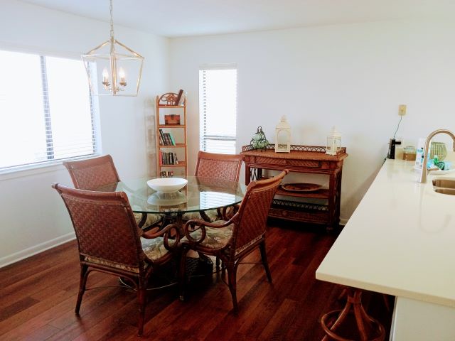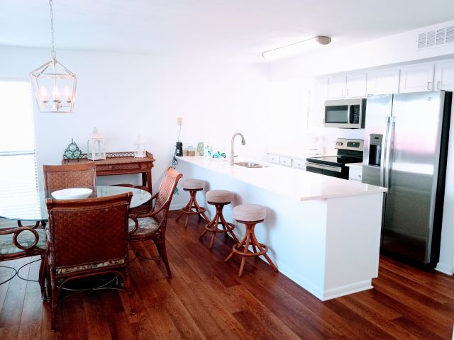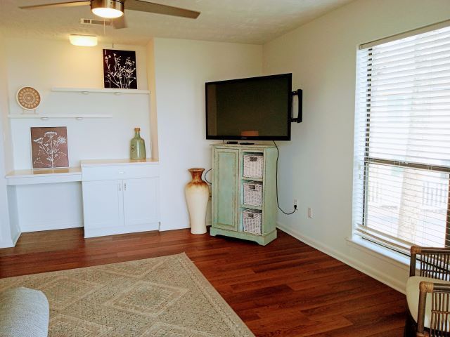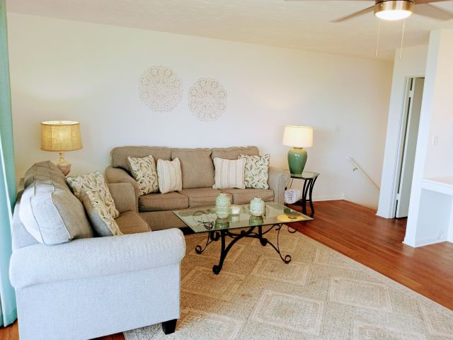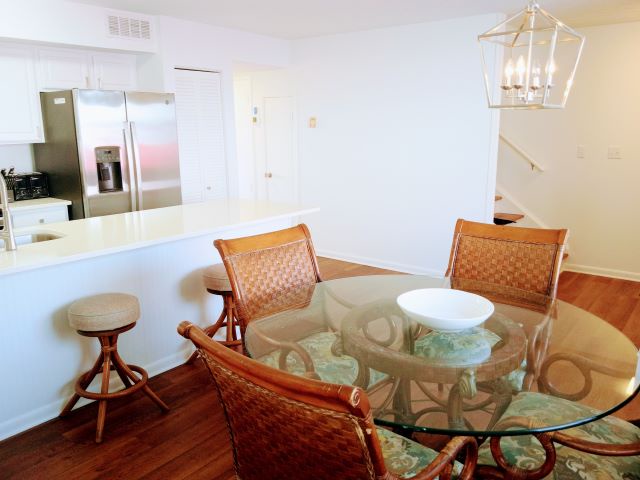 Upstairs, you'll find the inviting living room with a sleeper sofa, along with a guest bedroom featuring two twin beds—providing plenty of space for family and friends to relax after a day at the beach. Throughout the townhome, you'll enjoy hardwood flooring, stylish furnishings, and flat-screen TVs in every room for added comfort and convenience. Guests also have access to fantastic community amenities including a swimming pool and shuffleboard court.