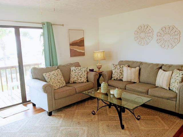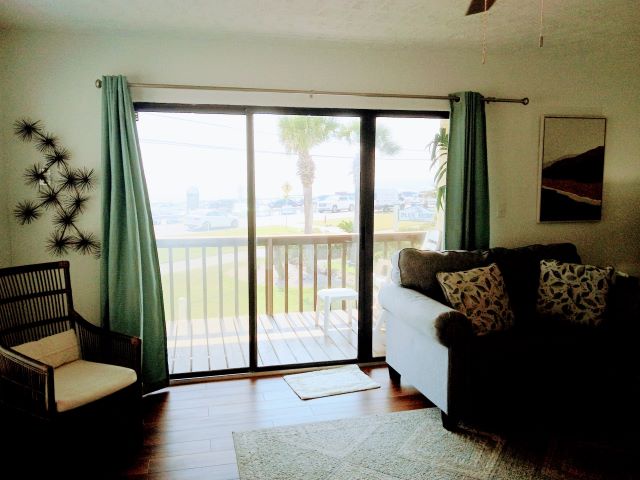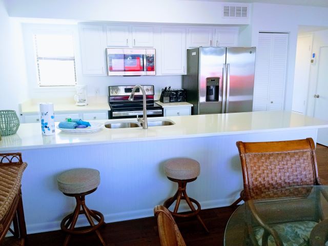 The main level features a fully equipped kitchen with stainless-steel appliances and updated countertops, a dining area perfect for gathering, and a queen master bedroom. Step out onto the balcony to enjoy refreshing Gulf breezes and scenic views.