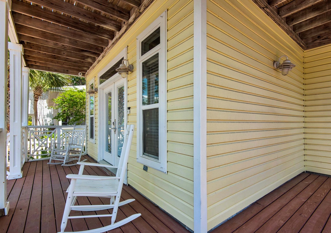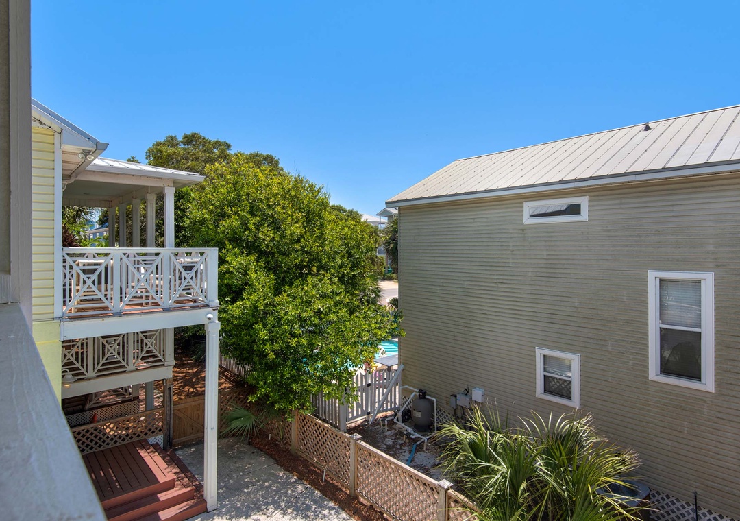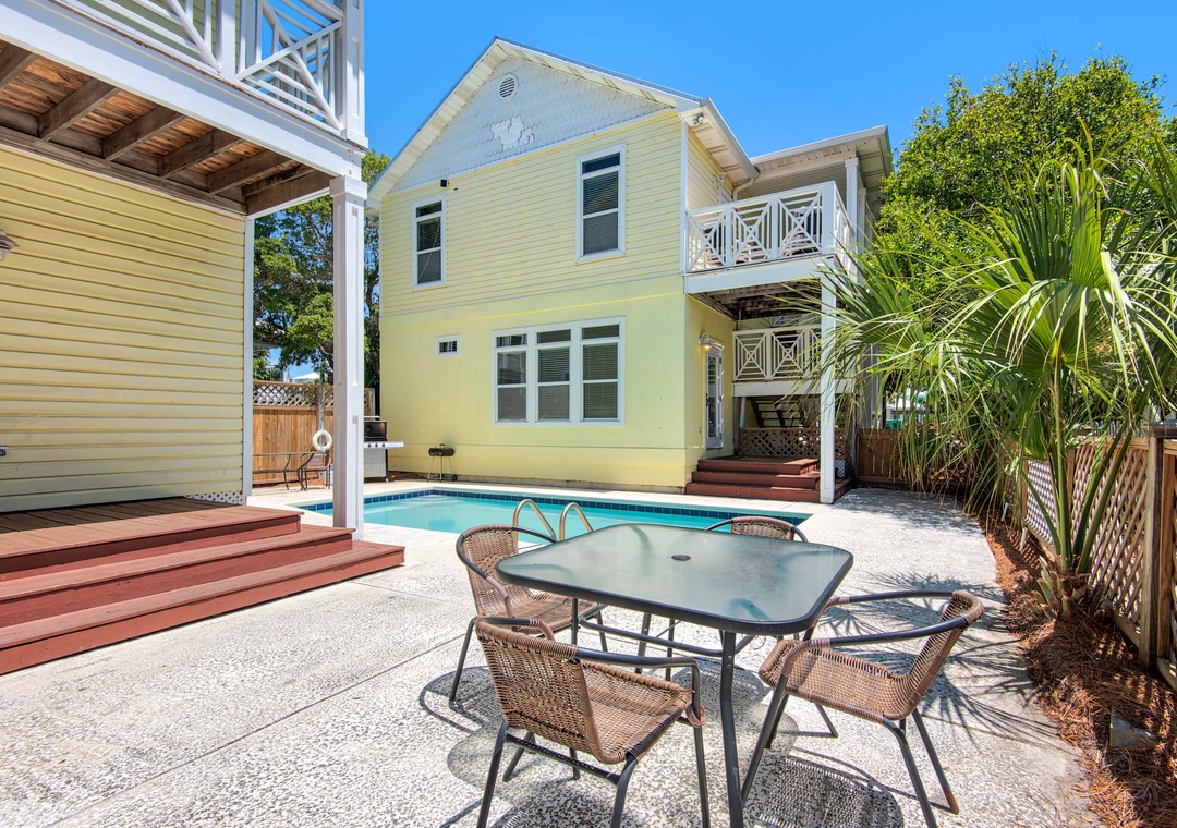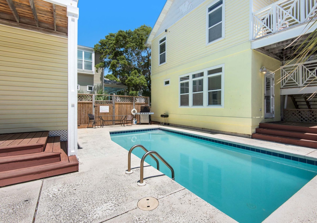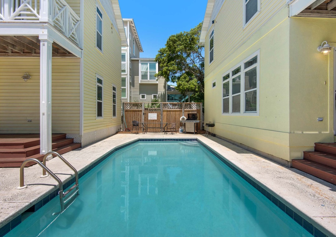 With 3 bedrooms in the front home, and 2 bedrooms in the guest house, this home will even provide easy access to guests who are unable to climb stairs. The private pool can be found in the middle and is furnished with 2 tables, 8 chairs, and has a gas grill perfect for entertaining. With plenty of space to soak in the sun, this home is ideal for a large group! With most bedrooms having access to the wraparound porch, guests can enjoy a cup of coffee as they soak in the breeze. Complete with private parking for up to 6 cars, this home truly has it all!!