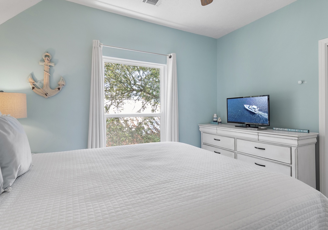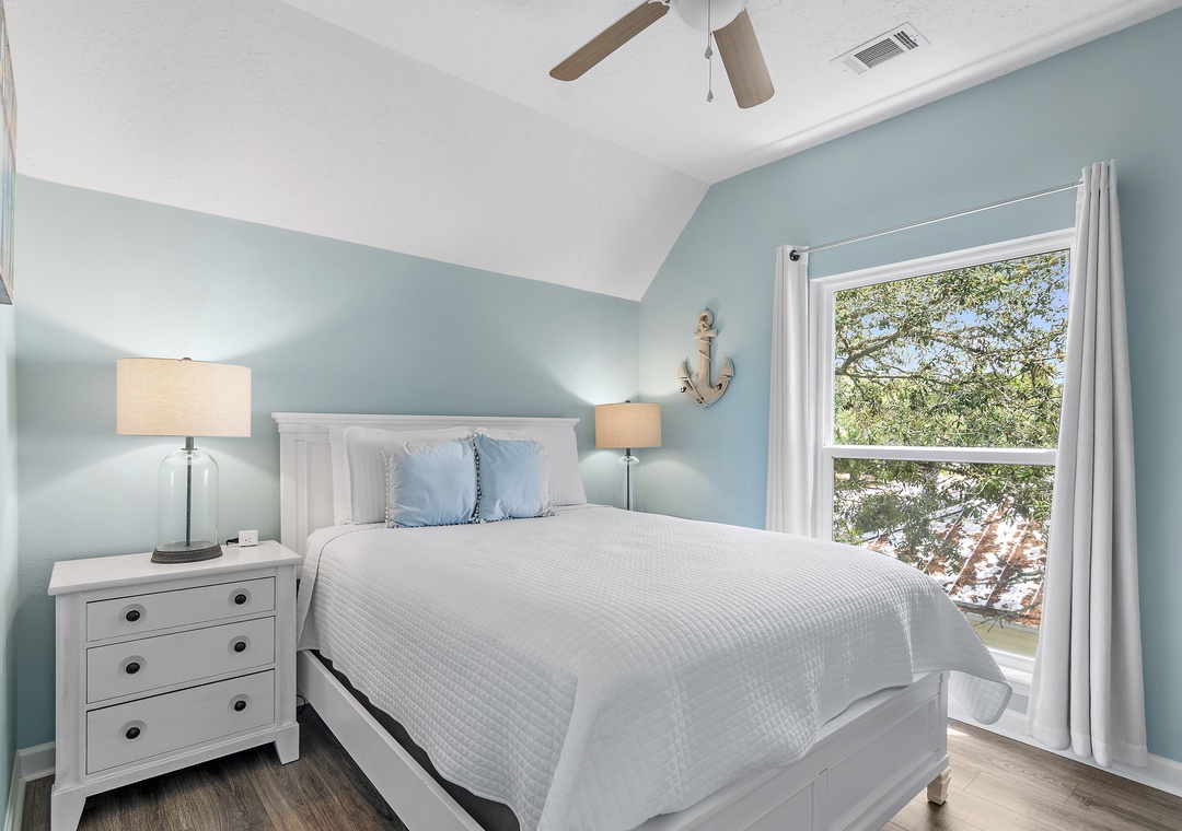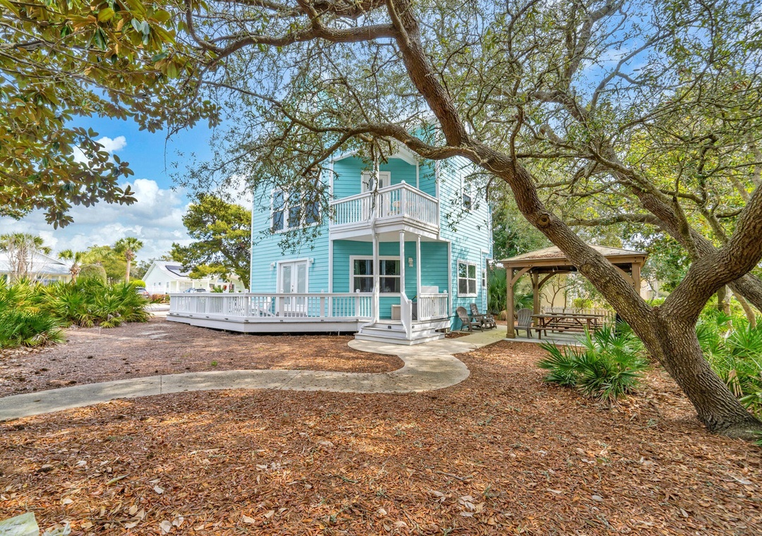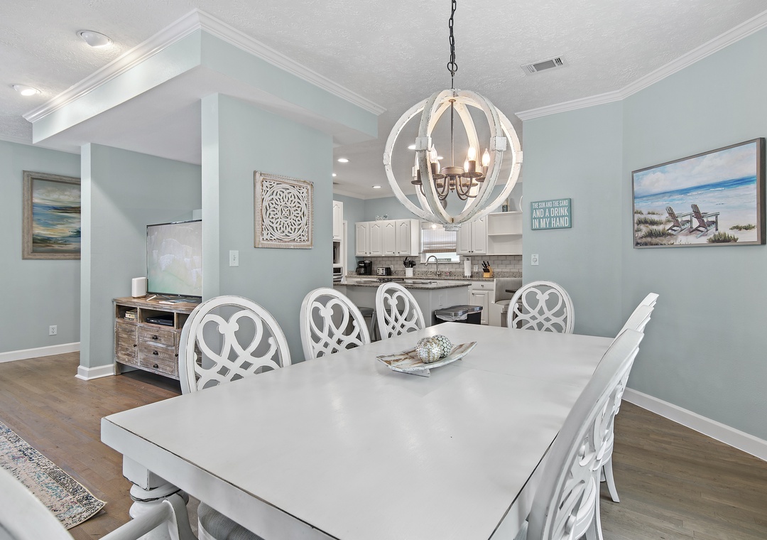 Welcome to By the Ocean Blue. Just steps from the crystal-clear waters and sugar-white sands of Crystal Beach, By the Ocean Blue is a stylish 4-bedroom, 3-bathroom getaway perfect for families and groups. Spanning three levels, this coastal retreat offers a mix of relaxation, fun, and thoughtful amenities. Enjoy a bright, open living space and a fully equipped kitchen with stainless steel appliances and a cozy breakfast nook. The home comfortably sleeps 12 with a king in the master suite (with private balcony), a full bed in one guest room, a kid-friendly bunk room with a twin-over-full and twin trundle, and a queen sleeper sofa. The spacious loft features a double queen setup, perfect for older kids or extra guests along with foosball table and gaming device. All bedrooms include flat-screen TVs, and the master ensuite boasts a luxurious walk-in shower. Outside, enjoy the yard with cornhole and grill under the gazebo. At By the Ocean Blue, comfort meets coastal charm—creating the perfect setting for your next beachside escape.
