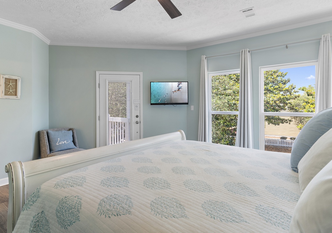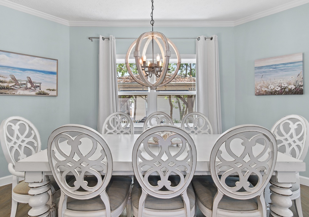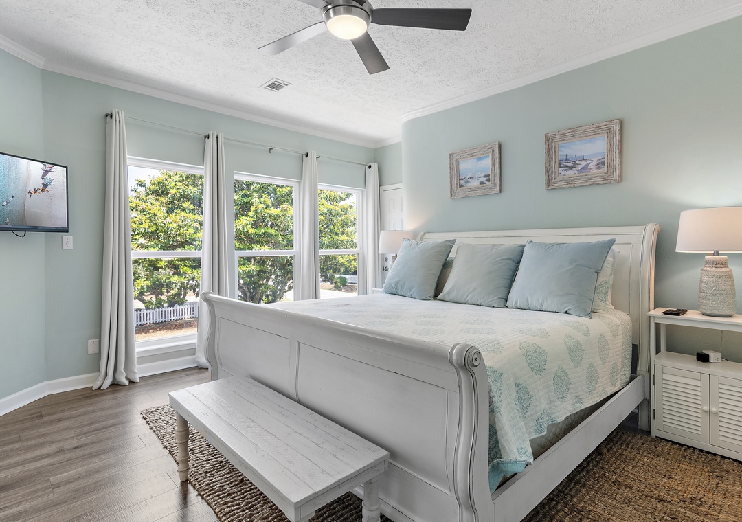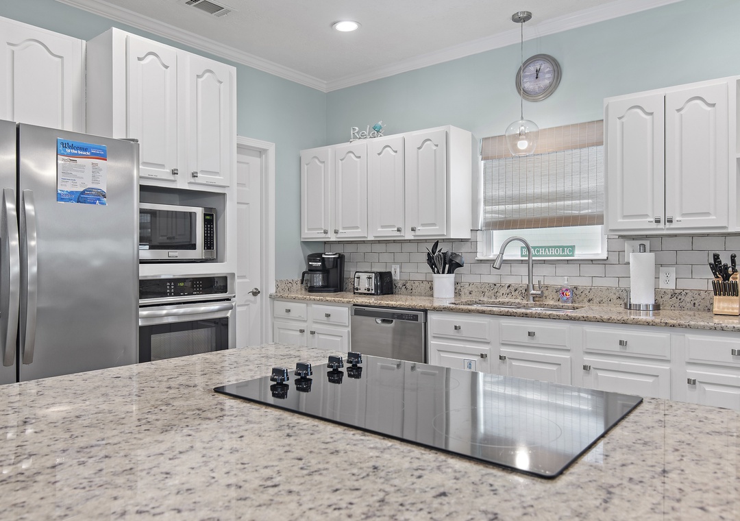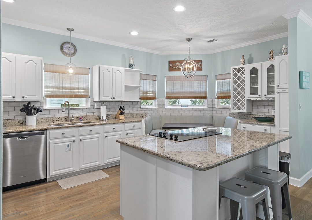 Welcome to By the Ocean Blue. Just steps from the crystal-clear waters and sugar-white sands of Crystal Beach, By the Ocean Blue is a stylish 4-bedroom, 3-bathroom getaway perfect for families and groups. Spanning three levels, this coastal retreat offers a mix of relaxation, fun, and thoughtful amenities. Enjoy a bright, open living space and a fully equipped kitchen with stainless steel appliances and a cozy breakfast nook. The home comfortably sleeps 12 with a king in the master suite (with private balcony), a full bed in one guest room, a kid-friendly bunk room with a twin-over-full and twin trundle, and a queen sleeper sofa. The spacious loft features a double queen setup, perfect for older kids or extra guests along with foosball table and gaming device. All bedrooms include flat-screen TVs, and the master ensuite boasts a luxurious walk-in shower. Outside, enjoy the yard with cornhole and grill under the gazebo. At By the Ocean Blue, comfort meets coastal charm—creating the perfect setting for your next beachside escape.