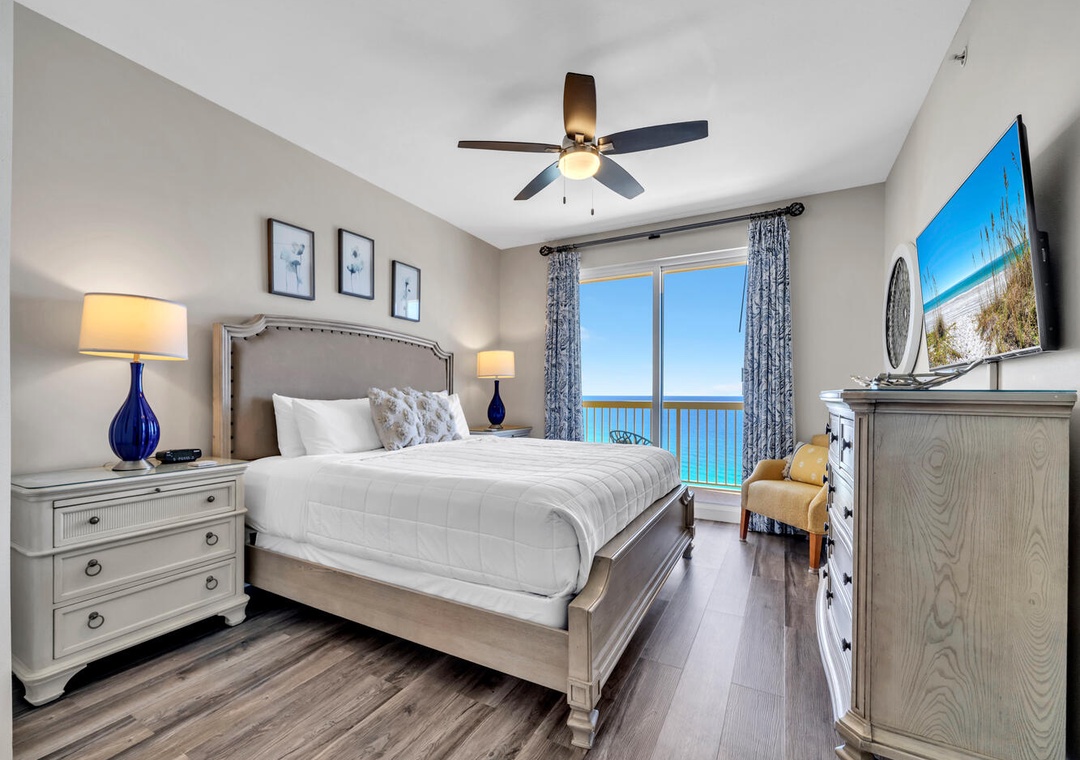 Connie, we are very happy to know that you found this updated three-bed, two-bath beachfront condo in Panama City Beach to be clean, spacious, and beautifully decorated and you would definitely recommend it to others. We apologize for any discomfort or inconvenience caused by the bed in the master bedroom and the available television programming. Thank you for your patience and for choosing Real Joy.Real Joy staff