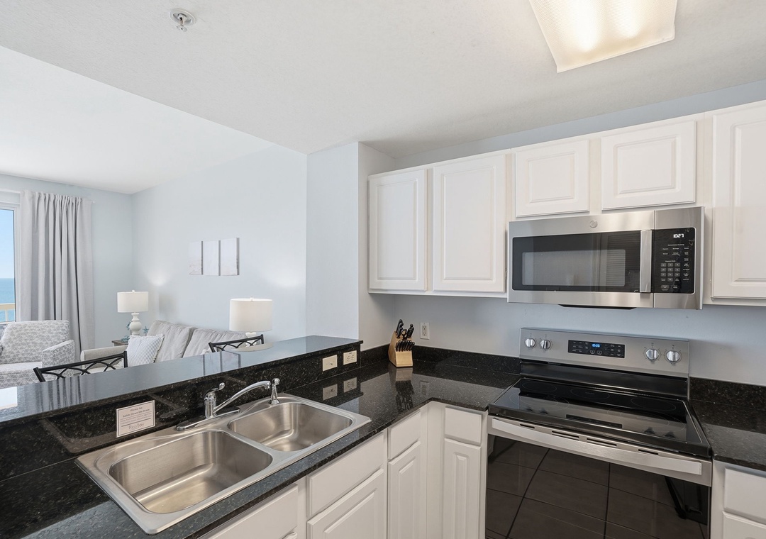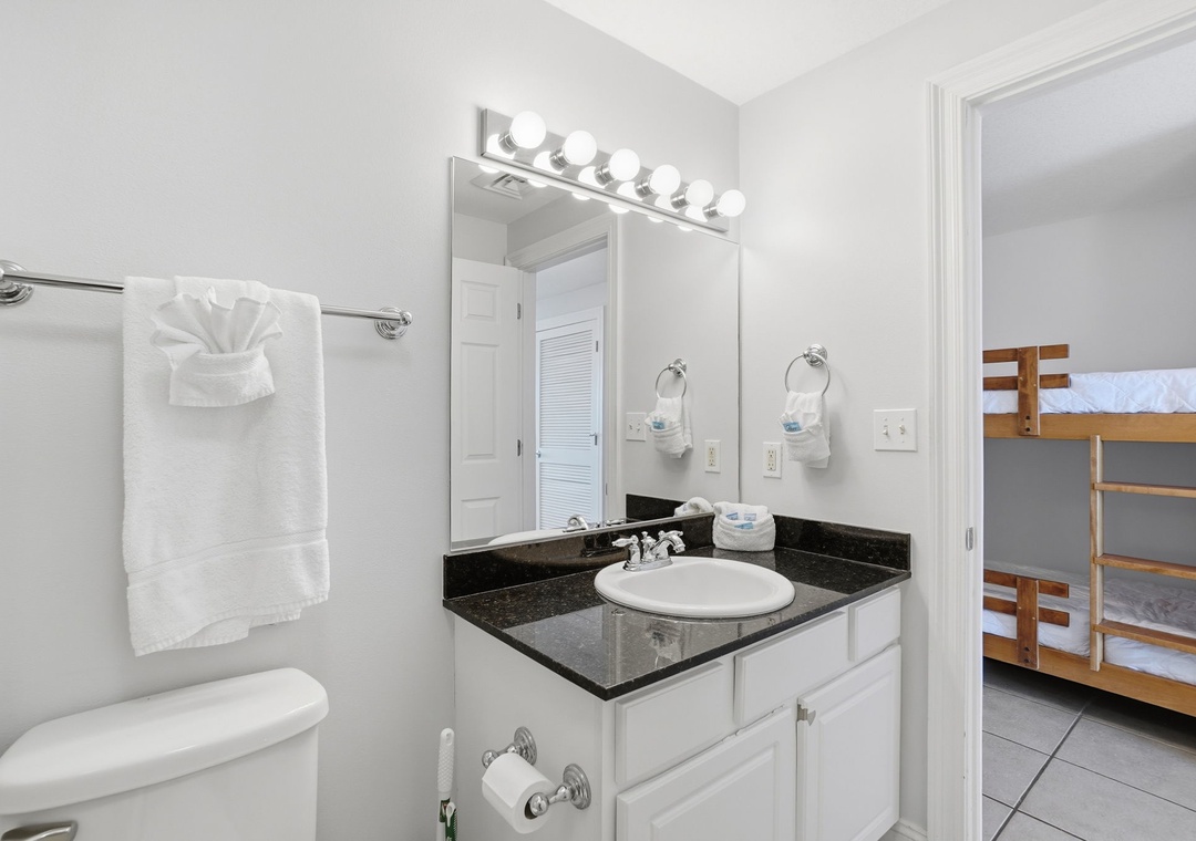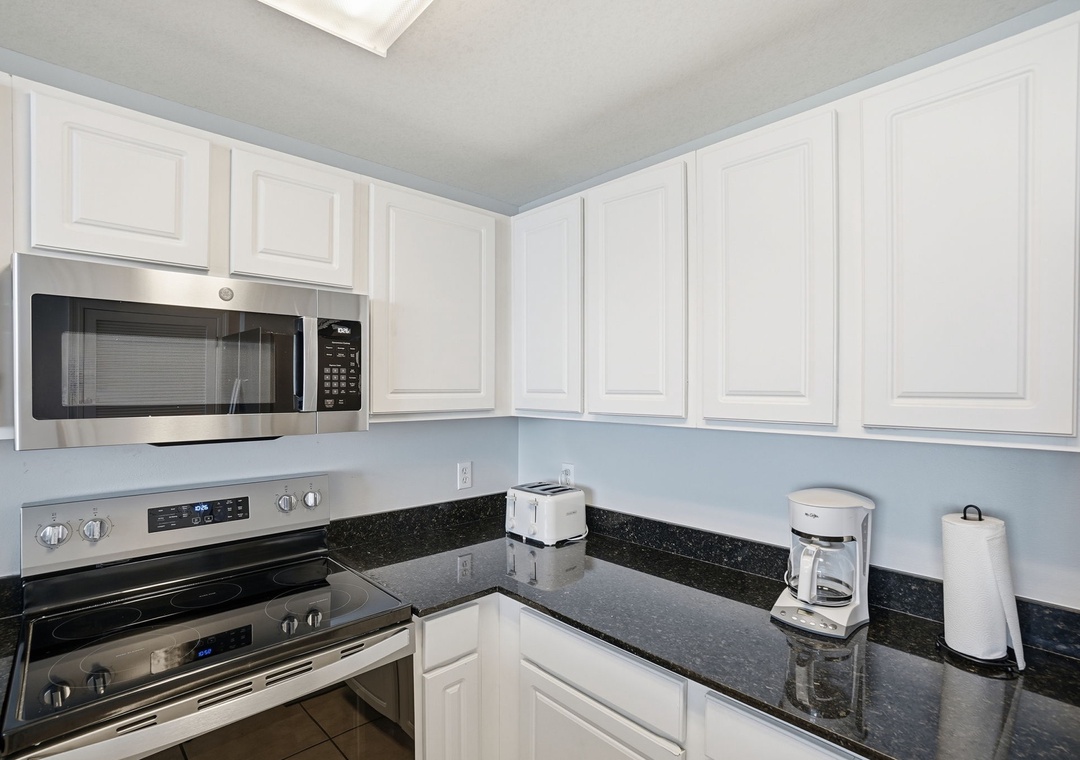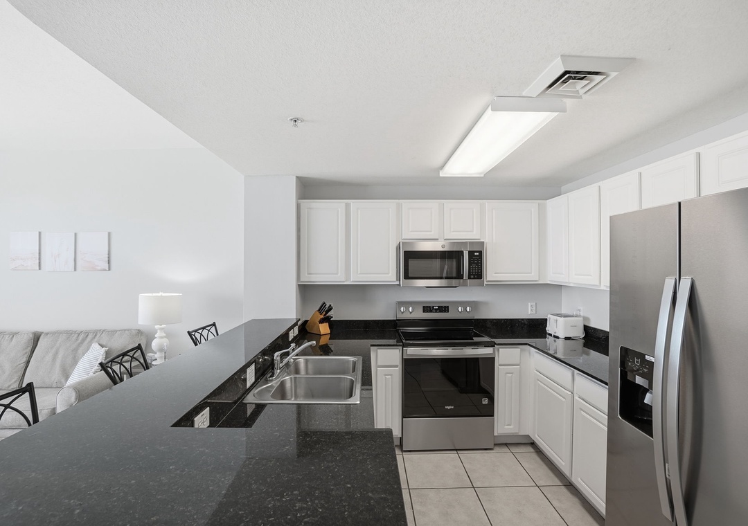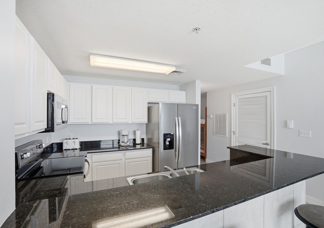 The fully equipped kitchen features sleek granite countertops and a convenient eat-in bar—perfect for morning coffee or casual meals. Both bathrooms are equally stylish with granite vanity tops, adding a touch of luxury to your stay.