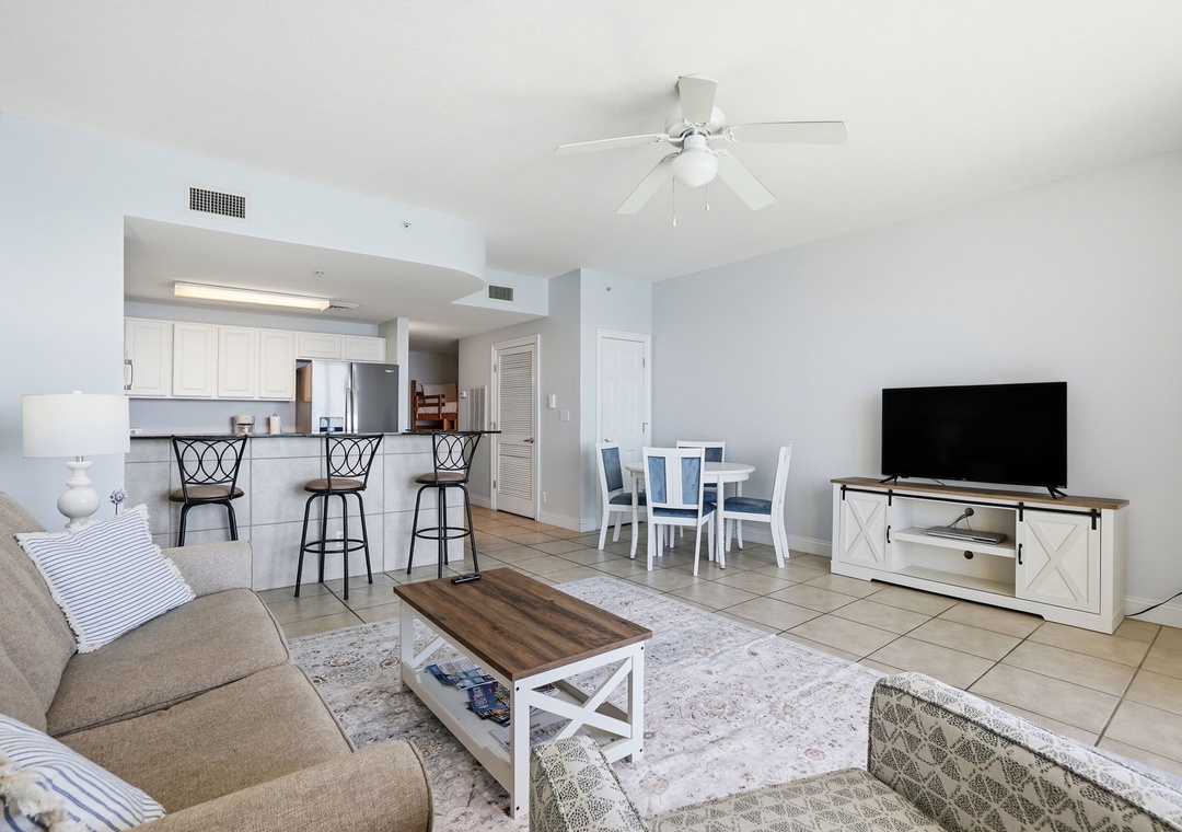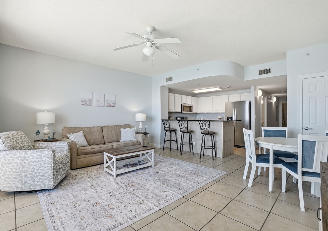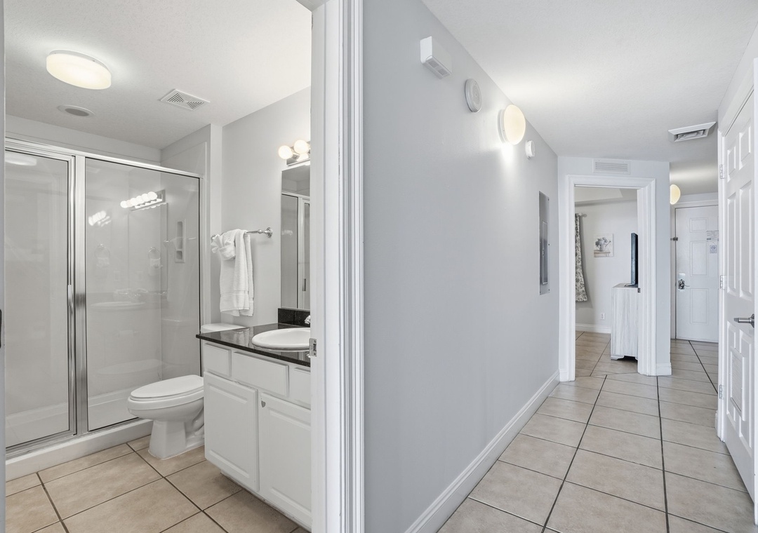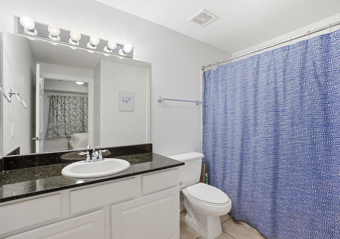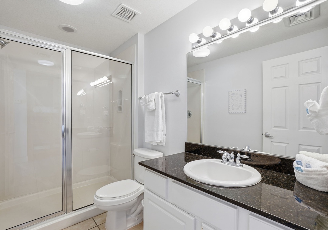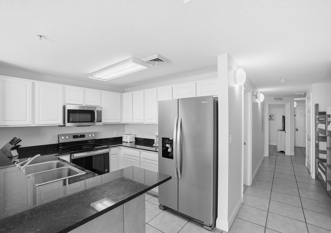 The fully equipped kitchen features sleek granite countertops and a convenient eat-in bar—perfect for morning coffee or casual meals. Both bathrooms are equally stylish with granite vanity tops, adding a touch of luxury to your stay.