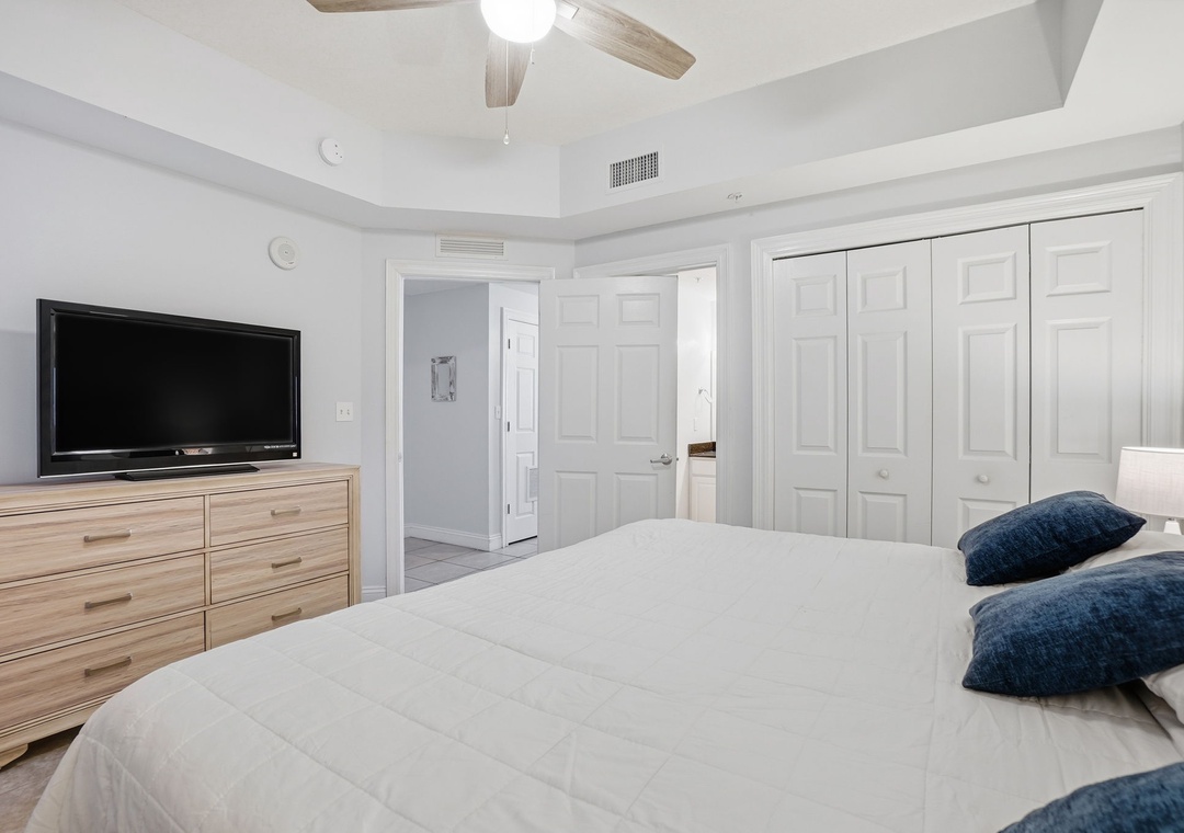 The spacious master bedroom includes a plush king-size bed and flat-screen TV for winding down in style. Traveling with family or friends? Additional sleeping arrangements include cozy hallway bunks and a sleeper sofa, comfortably accommodating up to six guests. Bonus: HBO is included in the cable package for all your movie-night needs!