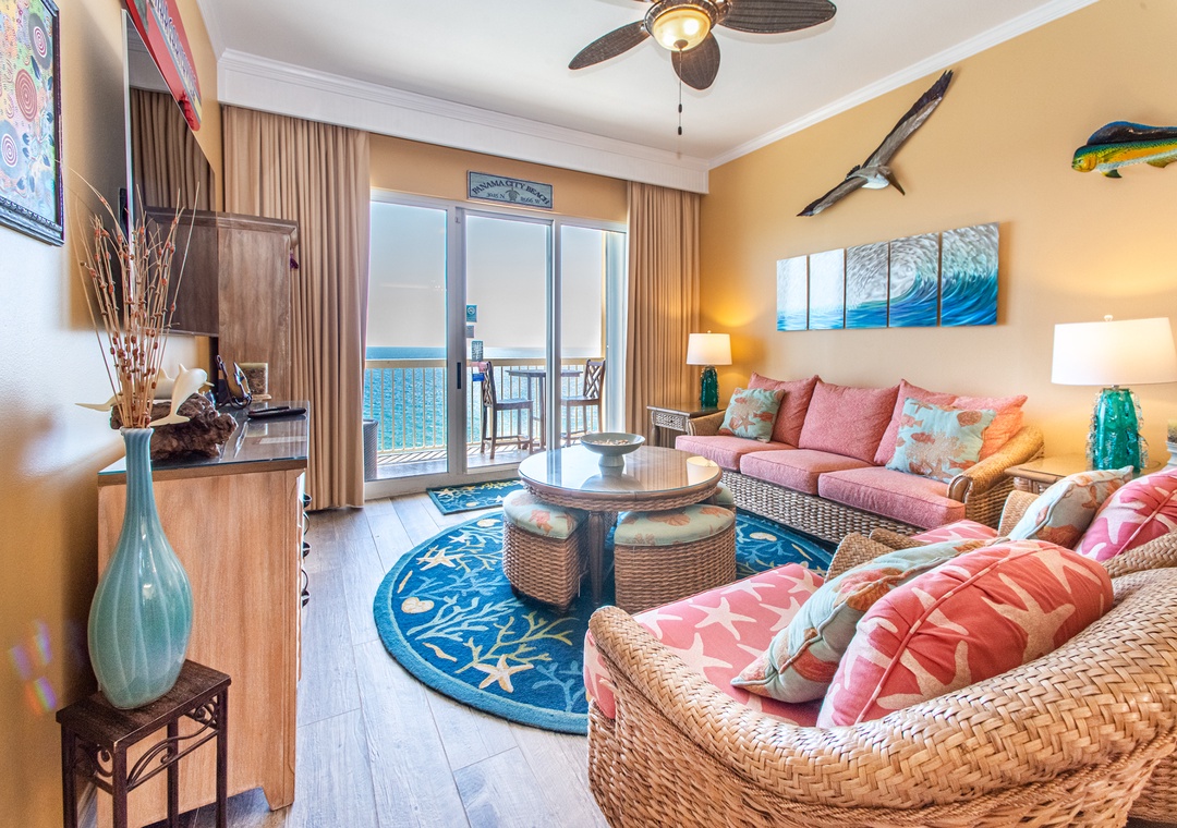 In the heart of Panama City Beach, Calypso Resort features TWO beachfront 23-story towers. The resort includes 2 large beachfront pools (seasonally heated), surrounded by a patio studded with palm trees, chaises, and tables where you can enjoy a snack or a game of cards while listening to the surf lap onto the sugar-white sands. There’s even a tiki bar in season, so you can enjoy a piña colada after your swim. And if swimming, kayaking, paddle boarding, canoeing, or windsurfing in the Gulf isn’t enough exercise for you, the complex also has a fitness center!