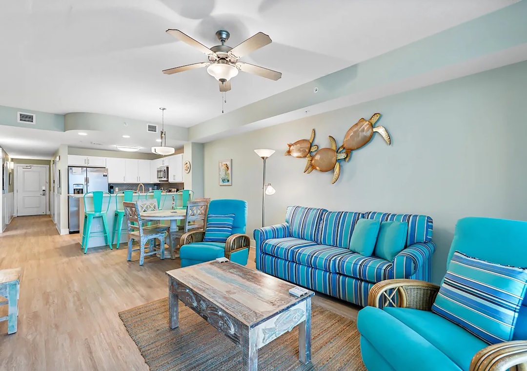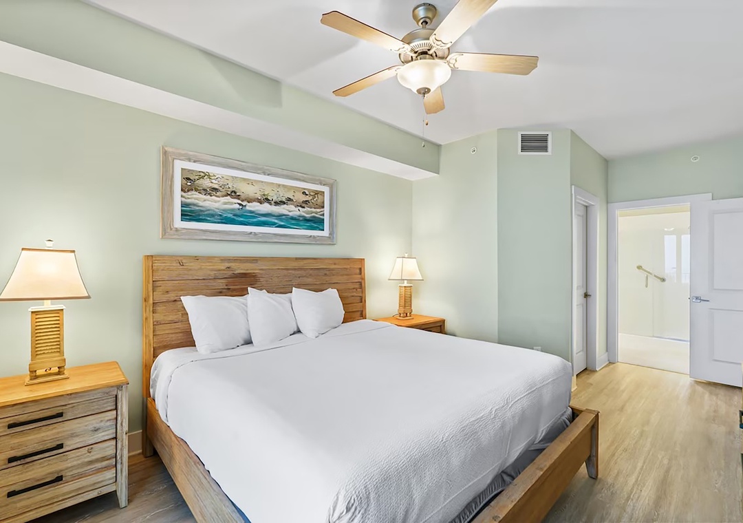 Calypso 3-1011 is a beautifully decorated 3-bedroom, 2-bathroom condo located in Panama City Beach within Calypso Tower III. You will love the open floor plan, boasting a fully stocked kitchen and a cozy coastal feel throughout. Free high-speed WiFi is also included for your convenience. Enjoy relaxing in front of the large flatscreen after a long day at the beach. The chef in your group will love the updated kitchen featuring granite countertops and new stainless steel appliances. There is also a washer/dryer for additional convenience. This condo comfortably sleeps 9 with a King master bedroom (ensuite bath), a King guest room, a bunk room with a Twin over Full bunk bed, and a sleeper sofa in the living room. Enjoy your morning coffee, meals, or your cocktail hour with spectacular views from your private balcony,y or rent one of the poolside cabanas to further enhance your stay. Find yourself relaxed and renewed in Calypso 3-1011 and make your new favorite vacation location!