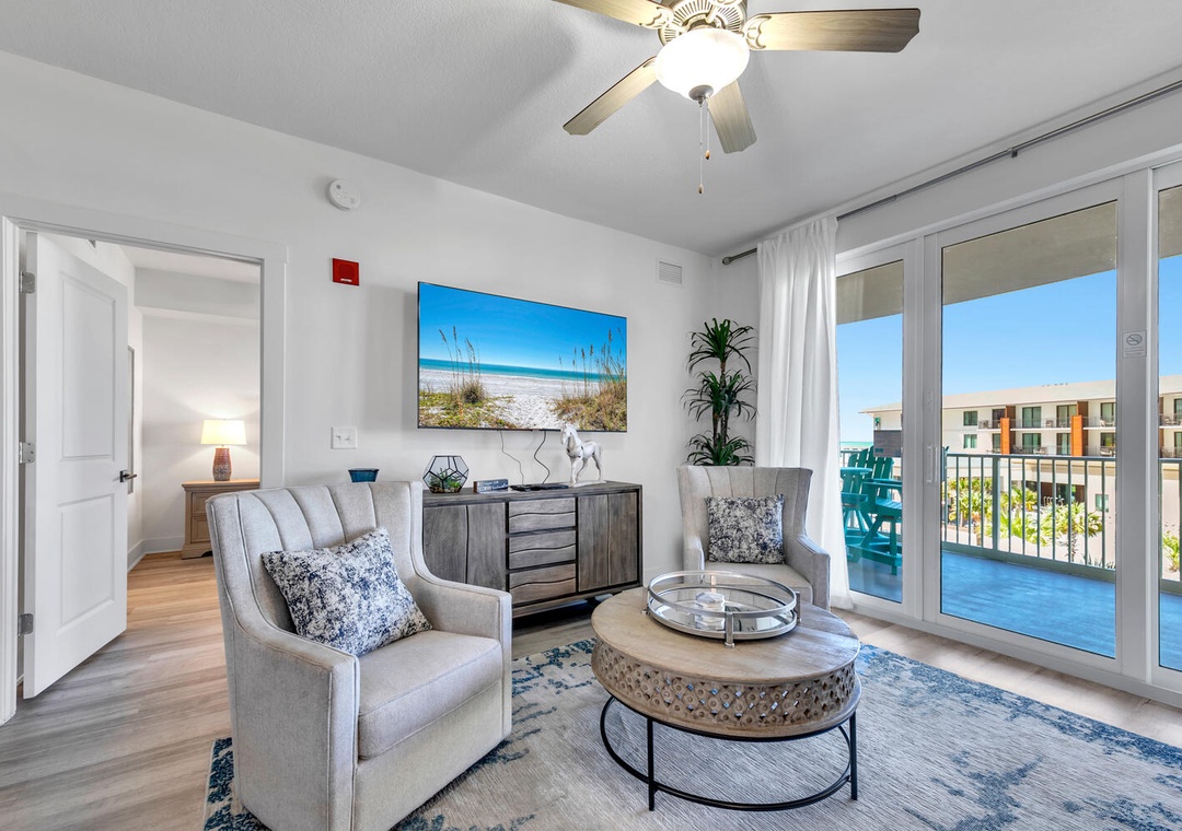 BRAND NEW CONDO boasts one of the largest balconies in PCB with incredible views of the Gulf of Mexico and beside Pier Park’s shopping/entertainment/fun. “Gypsea’s View” offers a King bed in the Primary Bedroom with an ensuite luxury bath. There is an additional full bath in the hall. The main living space provides a pull-out sofa for guests. This unit is in a premier location that overlooks the pool. It is situated on the third floor, which is conveniently the same level as the walkover beach access and the crosswalk that leads directly to the parking garage.