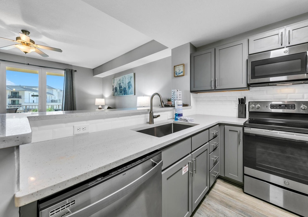 Calypso 3-310 is a gorgeous one-bedroom, two-bath condo in Panama City Beach. Located right across the street from the beach! This condo features all new furnishings, including a smart TV in the living room and bedroom fully equipped kitchen with stainless-steel appliances and granite counters, calming decor throughout, and a washer/dryer for additional convenience. With a king bed in the master bedroom, a set of twin bunks in the hall, and a sleeper sofa in the living room, this lovely condo comfortably sleeps 6. Enjoy your morning coffee on the large balcony that overlooks the pool, Tiki bars, and cabanas. The cabanas located near the pool area can be rented on-site. Make beautiful memories when you stay at Calypso 3-310!!