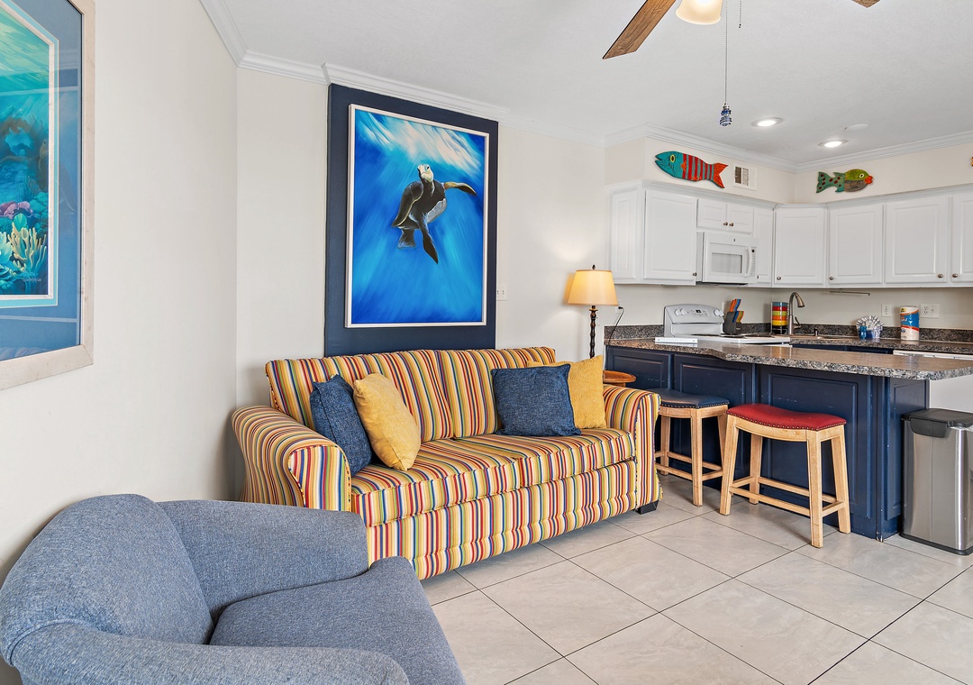 First time stay in this complex and unit, but a repeat customer with Harmony. The unit was very, very clean and neat. Although it advertises for 4, it would only be comfortable for 2 adults, and 2 smaller children in my opinion. The 2nd bed is a sleeper sofa, somewhat small. Very roomy shower though! Kitchen is nice, but very basic items stocked. If you cook a lot on trips, you'll need to bring a few things. Very short walk to the beach, and the beach area is very nice. Free beach service is a huge perk. Great location, close to all types of shopping. No pool, but, there's no room for one, but it would be nice. We would definitely stay here again.- Reviewed On: 10/24/2015