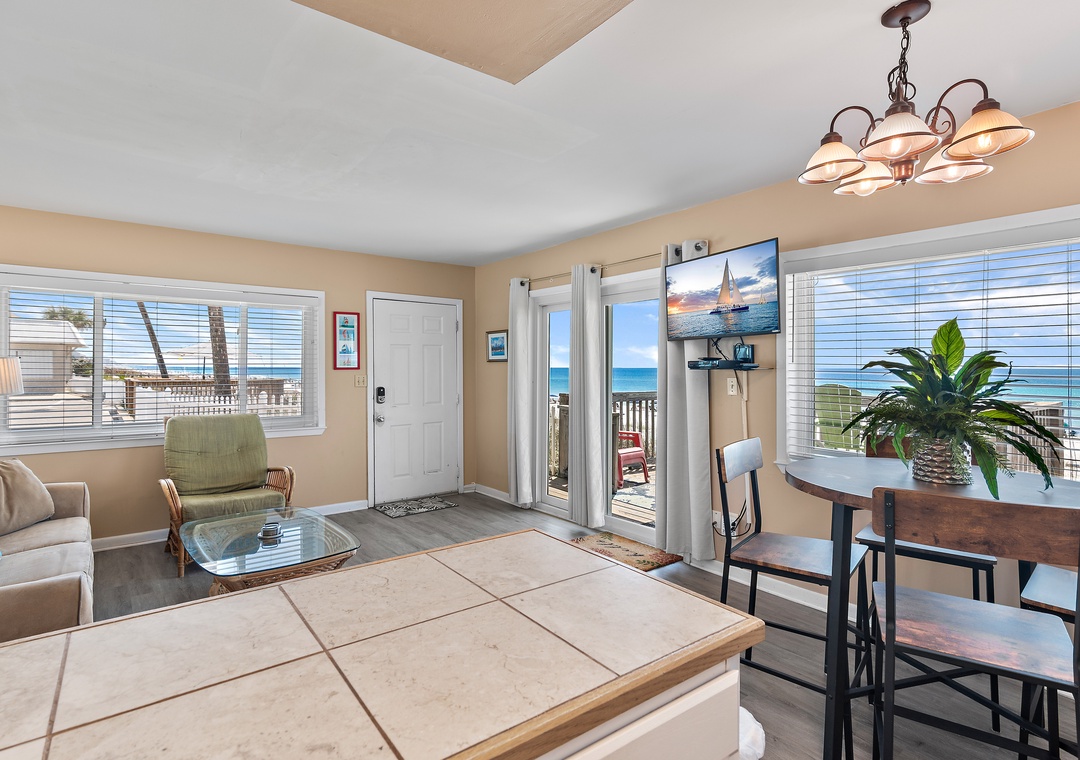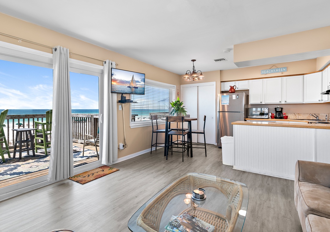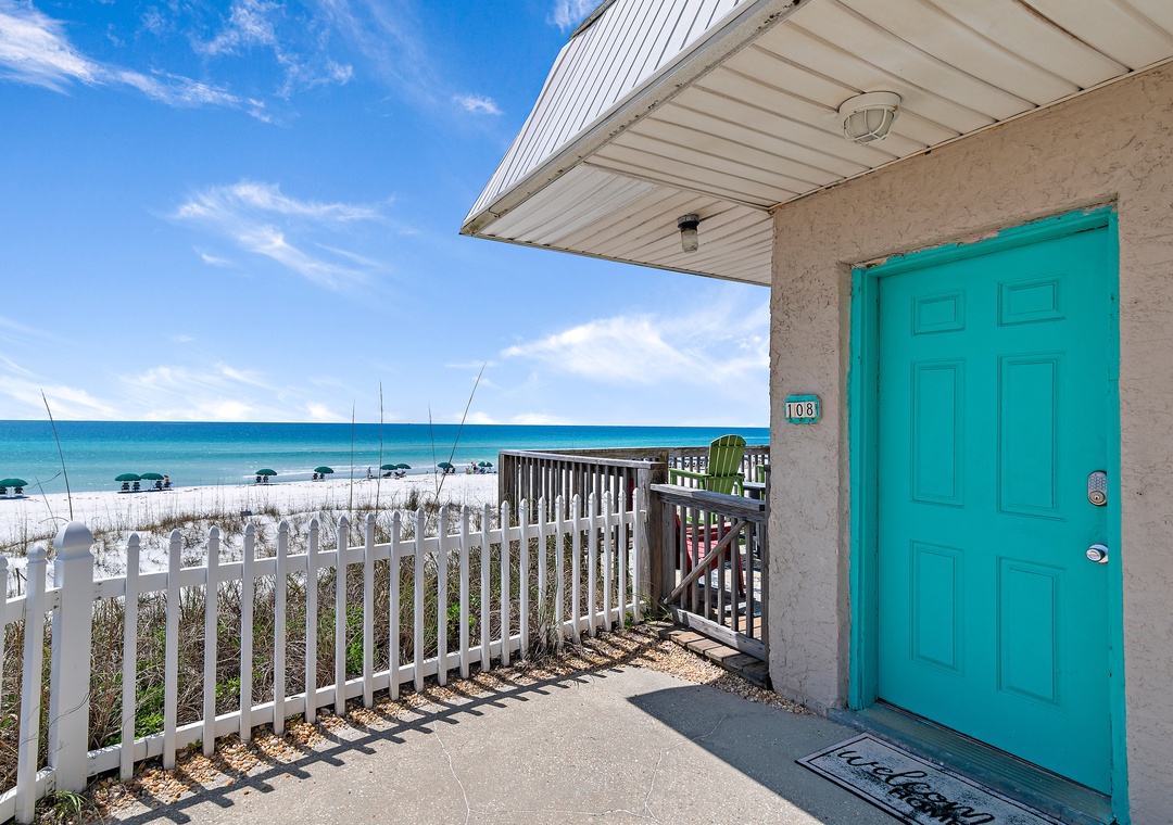Escape to Capri by the Gulf 108 - Beachy Keen Bungalow, a charming 1-bedroom, 1-bathroom condo perfect for a relaxing getaway. This end unit features a private deck where you can soak in breathtaking sunrises and sunsets. Sip your morning coffee while listening to the soothing sound of the waves gently crashing on the shore. The fully equipped kitchen is ready for you to prepare a delicious meal, and the cozy bedroom boasts a king-size bed for a restful night’s sleep. The living room offers a queen sleeper sofa, comfortably accommodating up to 4 guests. After a day of sunshine and fun, unwind with a movie in the living room with your loved one. Start creating unforgettable memories at Escape to Beachy Keen Bungalow today!