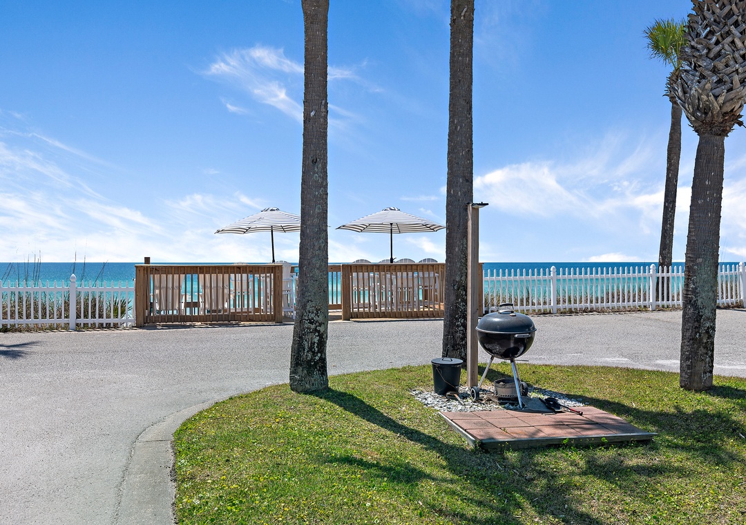 This beachfront complex offers the perfect vacation experience with plenty of parking and convenient community grills for outdoor cooking. Guests can relax on private patios with table seating overlooking the stunning beach views. For added convenience, an on-site laundromat is available. A scenic boardwalk provides easy access to the beach, where complimentary chairs and umbrellas await, ensuring a comfortable and relaxing spot on the soft white sand. Whether you're soaking up the sun or enjoying the ocean breeze, Capri by the Gulf destination has everything you need for a memorable getaway.