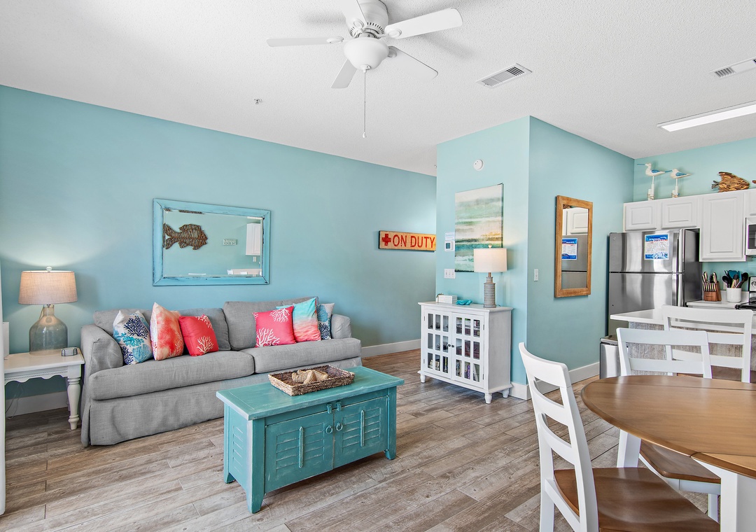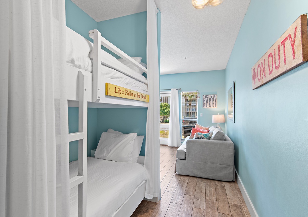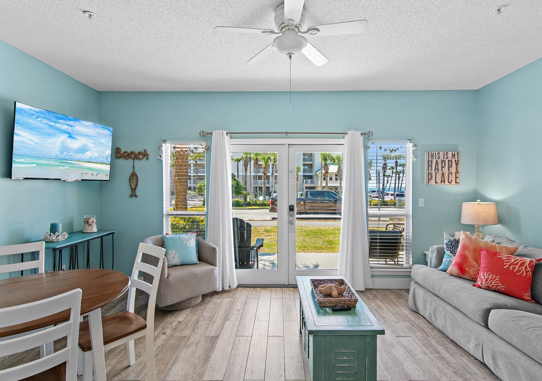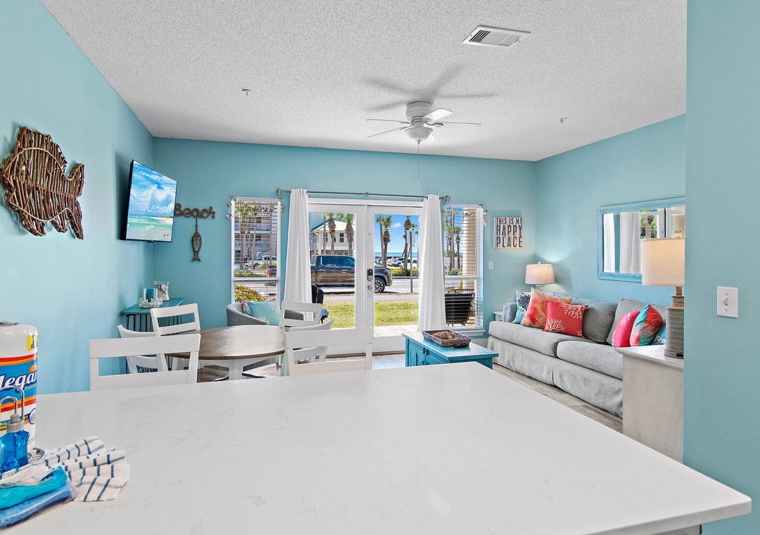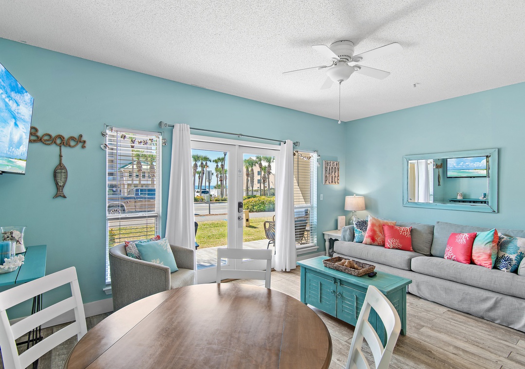 Welcome to Caribbean Dunes 105, a charming 1-bedroom, 1-bath ground-floor condo that comfortably sleeps up to 6 guests. This beachy retreat features a king bed in the master, twin-over-twin hallway bunks, and a sleeper sofa in the living room—perfect for families or a small group. Step outside to your private patio with peek-a-boo Gulf views, just steps from the sugar-white sands of Crystal Beach. Inside, enjoy the coastal decor and a fully equipped kitchen with stainless steel appliances, ideal for preparing meals after a day by the ocean. Caribbean Dunes 105 also offers access to a community pool, hot tub, and BBQ area, making it an ideal spot for a relaxing beach vacation.
