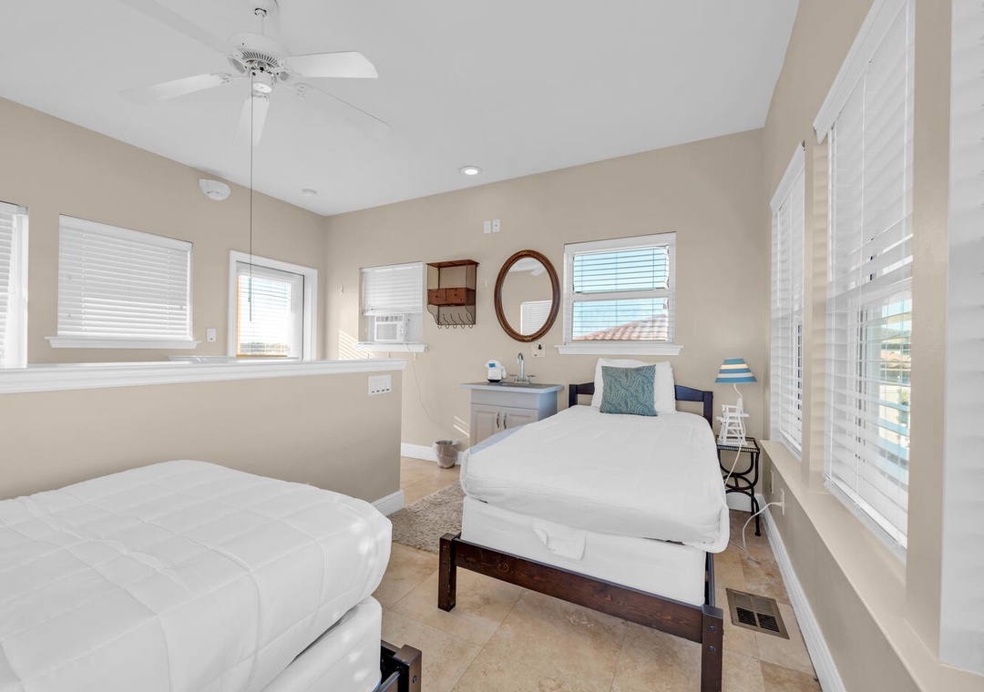 Across the street from the beach and a stones throw to the bakery/coffee shop! Comfortable king bed with en-suite bath on middle floor plus the master king having kid sized bunk beds in the big closet area off of the en-suite master bathroom - would be good for small children only. Twin loft area has cool views but may be warm up there midsummer-was fine for us in May. Downstairs queen bedroom was cute and comfy. Lots of porches! Good value and fun stay!- Reviewed On: 5/15/2025