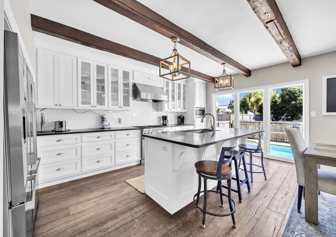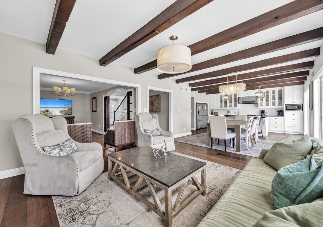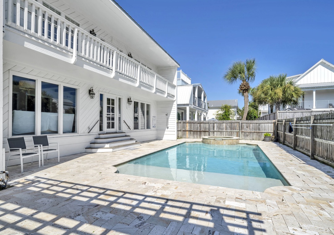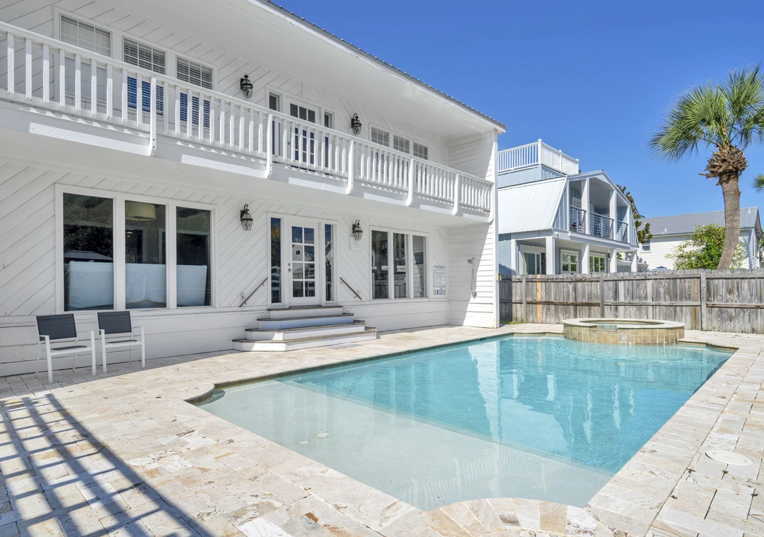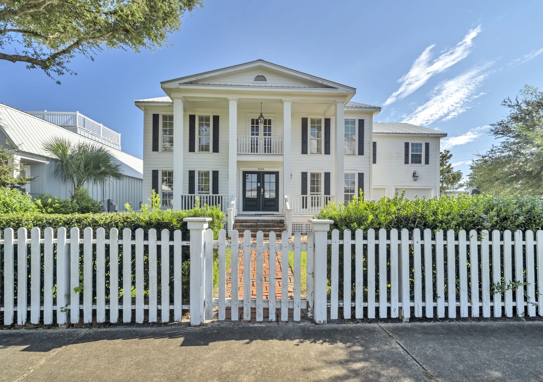 Casa Blanca is located a short walk from world-famous Crystal Beach in Destin’s Crystal Beach community. This 6br/5ba home exudes vacation perfection at every turn. The well-manicured exterior welcomes you on the vacation of your dreams, while a beautifully furnished interior has everything you will need to enjoy your time at the beach. This spacious three-story home offers an exquisite plantation-style facade behind a white picket fence. The main living room has beautiful, exposed beams, adding a sense of character to the bright open space. With space for 16, this home is the perfect size for a mixed group of friends and families. The master bedroom suite has cathedral ceilings and its own private balcony access overlooking the pool. While three of the six bedrooms are extra-large suites and all bedrooms offering King beds. There is also a bonus room on the third floor with two twin beds for the little ones in your group. You’re sure to hear giggles coming from this room all night long! You have two living rooms – one that opens into the living room and kitchen, and another that can serve as a media room on the second floor. The extra-large modern farmhouse style open kitchen boasts beautiful quartz countertops, beautiful subway tile backsplash, a gas range stove, double refrigerator and much more. You will find laundry rooms located on the 1st and 2nd level for added convenience. Downstairs, slip through the living room’s doors out to the backyard patio where your own oasis awaits. Enjoy a swim in the saltwater pool. Cook up some amazing fresh seafood on the gas grill while relaxing with a drink in the beautiful backyard. Of course, you’re here for the beach, so don’t delay in heading down to the shore! Beach access is just a quick eight-minute walk away from your home. Spread out your beach blanket, set up your chairs, and sit back and relax. Endless fun under the sun awaits at Casa Blanca!