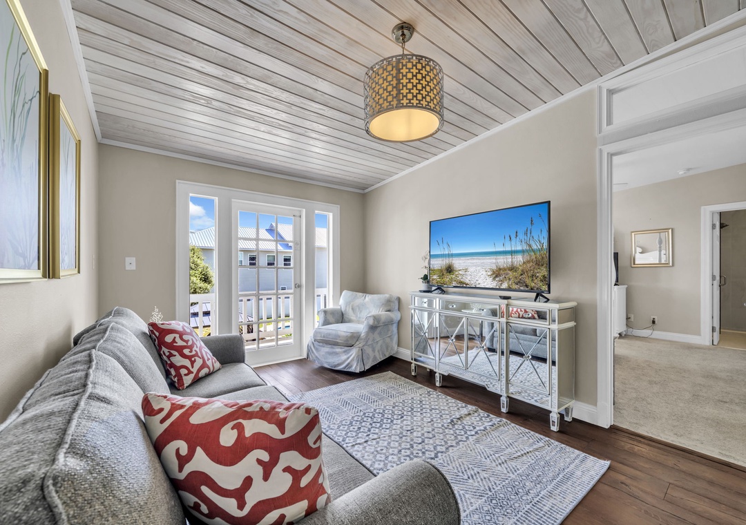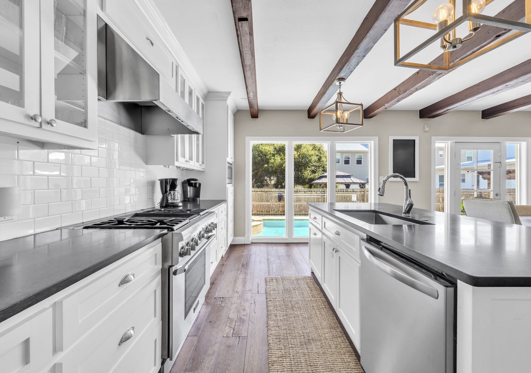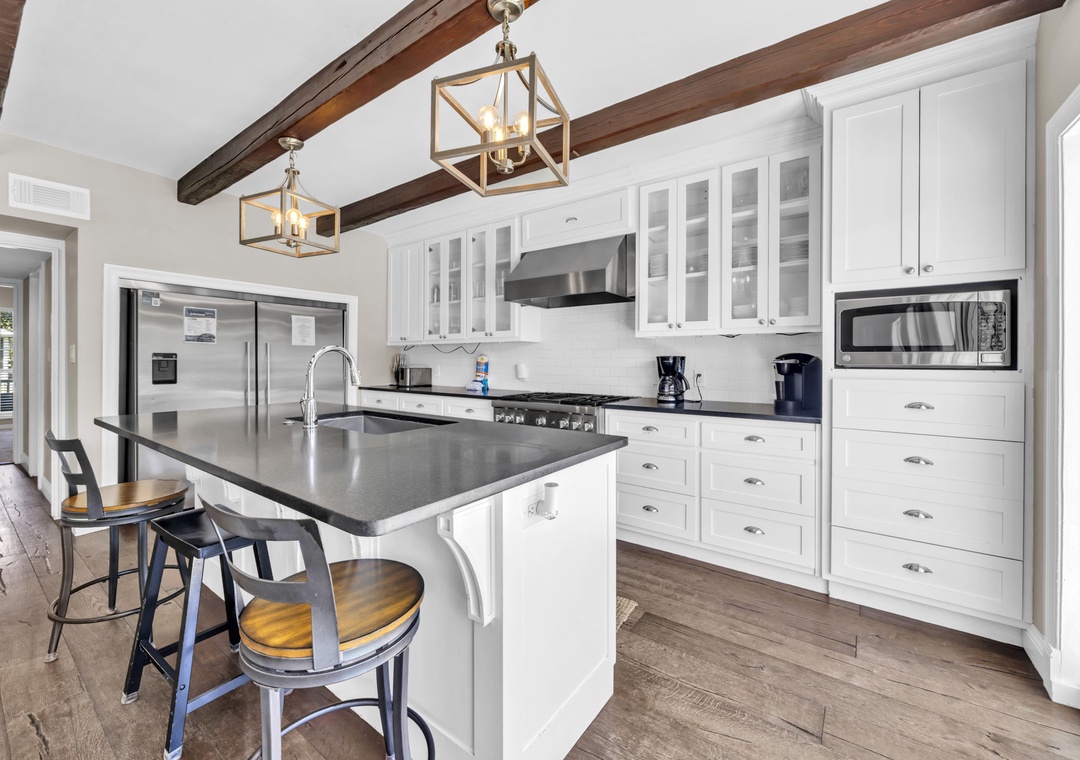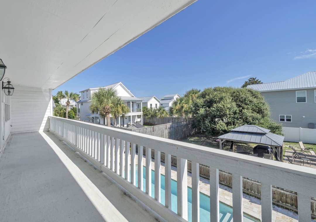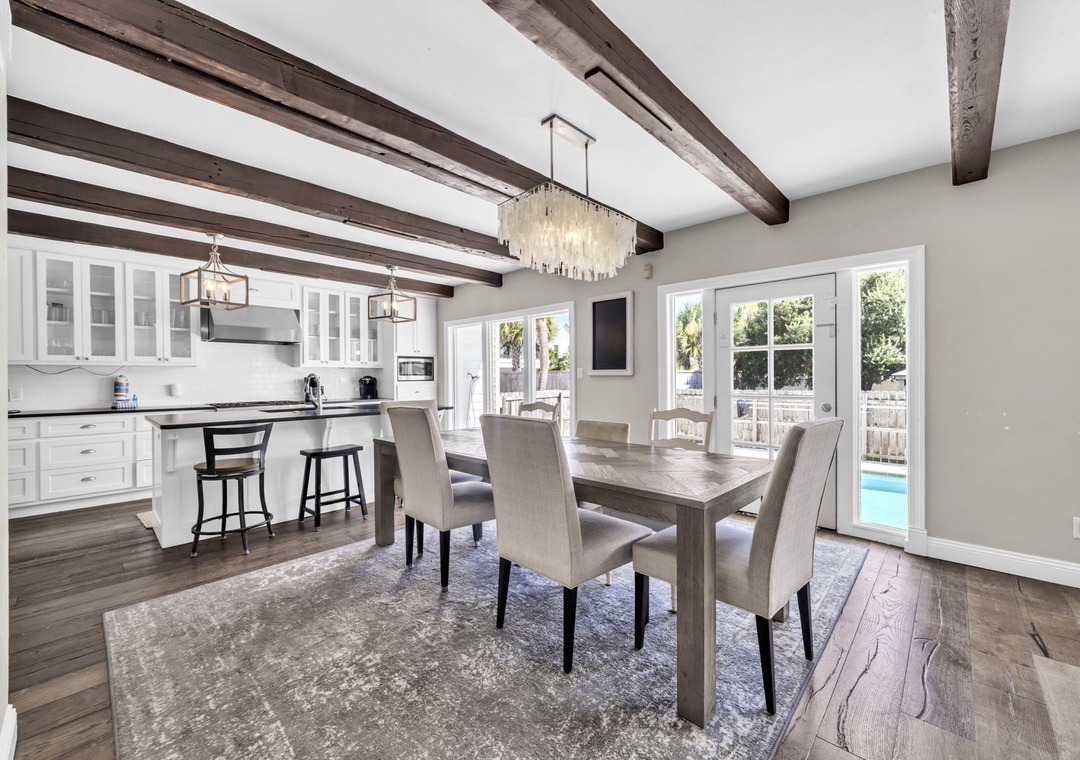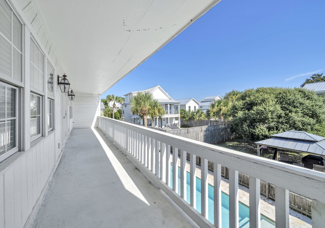 Casa Blanca is located a short walk from world-famous Crystal Beach in Destin’s Crystal Beach community. This 6br/5ba home exudes vacation perfection at every turn. The well-manicured exterior welcomes you on the vacation of your dreams, while a beautifully furnished interior has everything you will need to enjoy your time at the beach. This spacious three-story home offers an exquisite plantation-style facade behind a white picket fence. The main living room has beautiful, exposed beams, adding a sense of character to the bright open space. With space for 16, this home is the perfect size for a mixed group of friends and families. The master bedroom suite has cathedral ceilings and its own private balcony access overlooking the pool. While three of the six bedrooms are extra-large suites and all bedrooms offering King beds. There is also a bonus room on the third floor with two twin beds for the little ones in your group. You’re sure to hear giggles coming from this room all night long! You have two living rooms – one that opens into the living room and kitchen, and another that can serve as a media room on the second floor. The extra-large modern farmhouse style open kitchen boasts beautiful quartz countertops, beautiful subway tile backsplash, a gas range stove, double refrigerator and much more. You will find laundry rooms located on the 1st and 2nd level for added convenience. Downstairs, slip through the living room’s doors out to the backyard patio where your own oasis awaits. Enjoy a swim in the saltwater pool. Cook up some amazing fresh seafood on the gas grill while relaxing with a drink in the beautiful backyard. Of course, you’re here for the beach, so don’t delay in heading down to the shore! Beach access is just a quick eight-minute walk away from your home. Spread out your beach blanket, set up your chairs, and sit back and relax. Endless fun under the sun awaits at Casa Blanca!